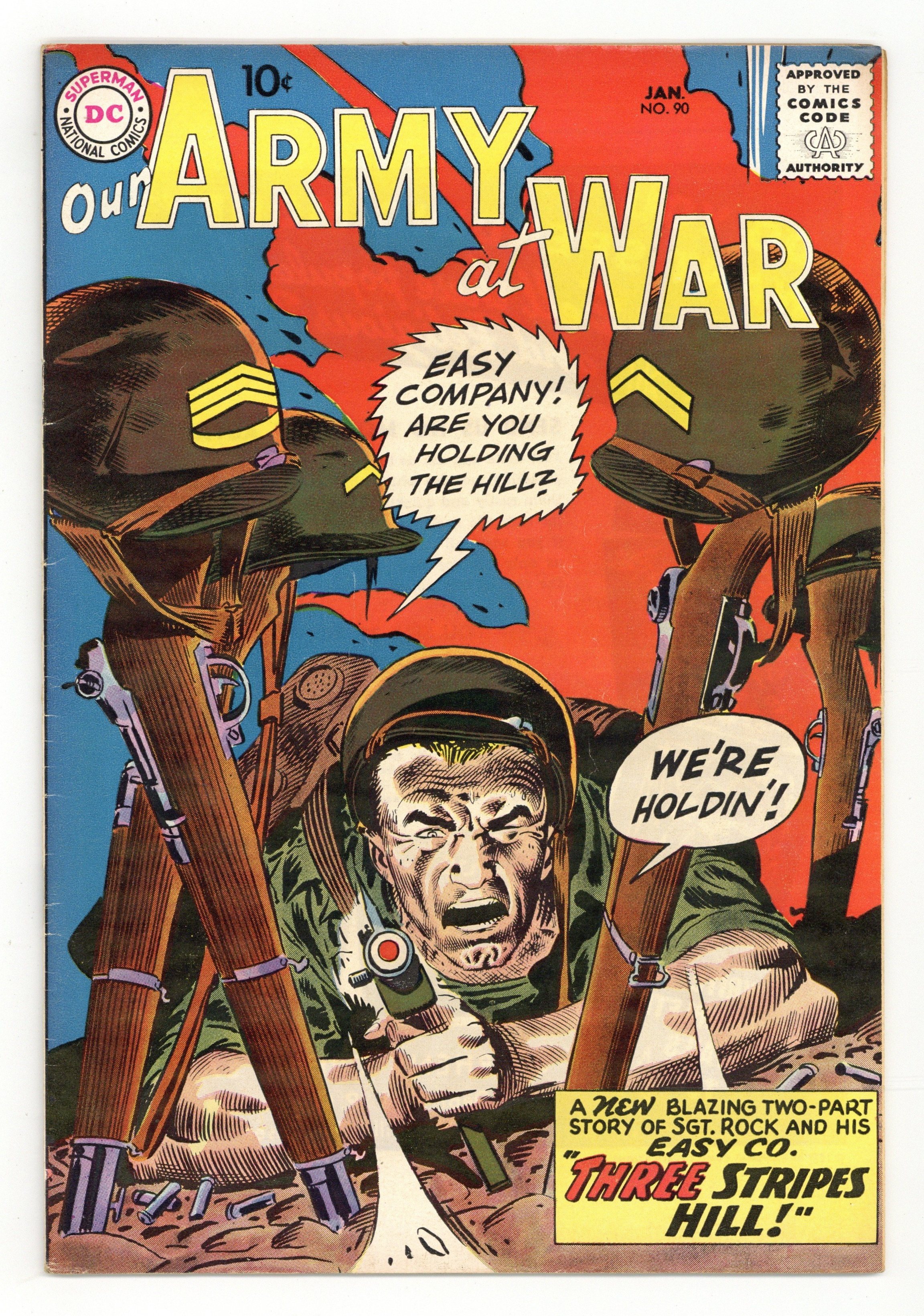 Starts Jan 26 Cover art by Joe Kubert. 3 Stripes Hill! starring Sgt. Rock, script by Bob Kanigher, art by Joe Kubert. A Jet Called Ace, script by Hank Chapman, art by Jerry Grandenetti. Rearguard, script by Bob Haney, pencils by Bob Forgione, inks by Jack Abel. 36 Pages, Full Color. Cover price $0.10.