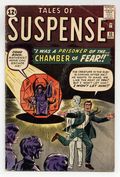 Starts Mar 16 Cover pencils by Jack Kirby, inks by Dick Ayers. "I was Trapped in the Chamber of Fear!", pencils by Jack Kirby, inks by Dick Ayers; A man tries to pitch to Stan Lee the story of a blackmailer who becomes trapped within a mystic ruby as an agent of Fate to direct recently departed souls to their destination; Stan rejects the story as too outlandish even for Tales of Suspense and the man leaves the office. "Bird Talk" text story. "The Mystery of the Tax Collector from Space!", pencils by Jack Kirby, inks by Dick Ayers; A failed actor finds a spaceship with a dead pilot and uses it in an attempt to con the authorities; The ship is actually a decoy, and is retrieved by the aliens to get a human specimen for their zoo. "The Secret of the Mirage," art by Don Heck; A doctor goes to the Middle East to treat the local people; He is attacked by bandits for curing the local sheikh, and chased into a desert mirage, which takes him to a utopian world. "Where Is the Wommelly?", script by Stan Lee (signed), art by Steve Ditko; An alien armada attempts to conquer Earth, but is driven off; One of the ships is damaged and forced to land on Earth, its pilot an outcast forever on the planet; The military is convinced they will capture the alien at any moment since it must be of monstrous appearance. 36 pages, full color. Cover price $0.12.