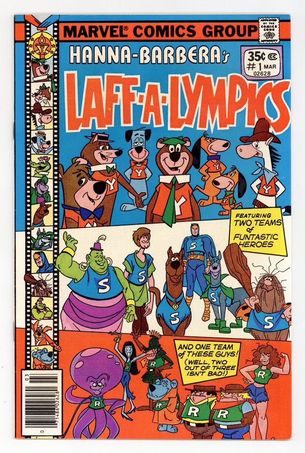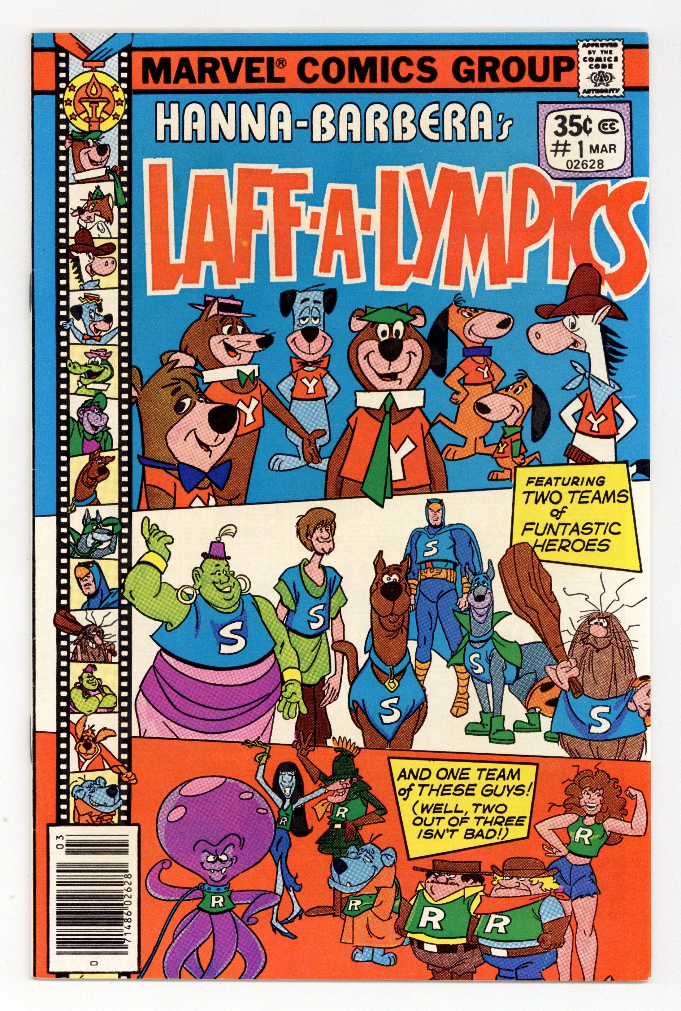 Starts Jan 26 Cover pencils by Mark Evanier. "The Meet at Mount Ono," script by Mark Evanier, pencils by Jack Manning, inks by Scott Shaw; The Laff-a-Lympians have to climb the dreaded Mount Ono; appearances by Yogi Bear; Scooby Doo; Mumbly; Snagglepuss; Mildew Wolf; Shaggy; Dynomutt; Captain Caveman; Boo Boo Bear; Huckleberry Hound; Wally Gator; Blue Falcon; Augie Doggie; Doggie Daddy; Quick Draw McGraw; Dinky Dalton; Hokey Wolf; Babu the Genie; Pixie & Dixie; Dread Baron; Dee Dee Skyes; Taffy Dare; Brenda Chance; The Creepleys; Orful Octopus; Hong Kong Phooey; Cindy Bear; Yakky Doodle Duck; Mr. Jinks; Grape Ape; Daisy Mayhem; Fondoo the Magician; Dirty Dalton; and Dastardly Dalton. "The Funtastic World of Hanna-Barbera: Laff-a-Lympics" article by Mark Evanier. 36 pgs., full color. Cover price $0.35.