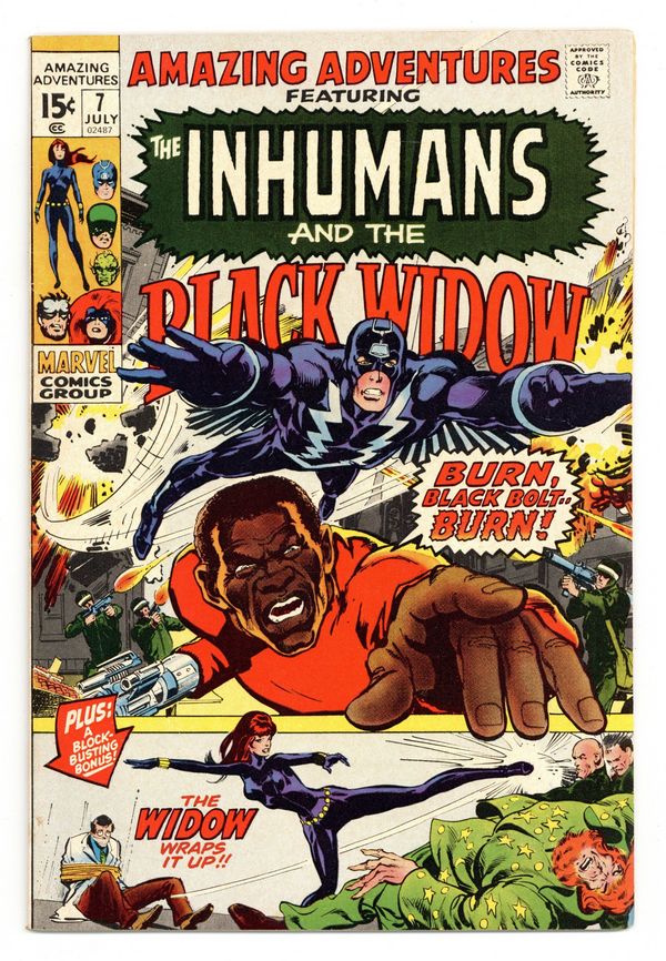 Ends Mar 9 7:10 PM CST Bid History 5 bids Current Bid $16 Your Secret Max Bid If you'd like to bid, please log in or register. Cover pencils by Jack Kirby (Inhumans) and John Romita (Black Widow), inks by John Romita. "Beware... the Inhumans!", script by Jack Kirby, pencils by Jack Kirby, inks by Chic Stone; Two missiles are shot at the Inhumans; The second one is destroyed just before it hits and the wreckage points to the Fantastic Four as the ones firing it. "Then Came... the Black Widow," script by Gary Friedrich, pencils by John Buscema, inks by John Verpoorten; Black Widow, bored by her civilian life, gets a new costume. 36 pgs, full color. $0.15. Cover price $0.15.