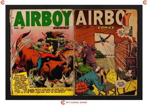 Issues Vol. 5 #8 and Vol. 9 #4 of Airboy Comics (1945-1953 Hillman). Most will grade in the GD to FR range.
