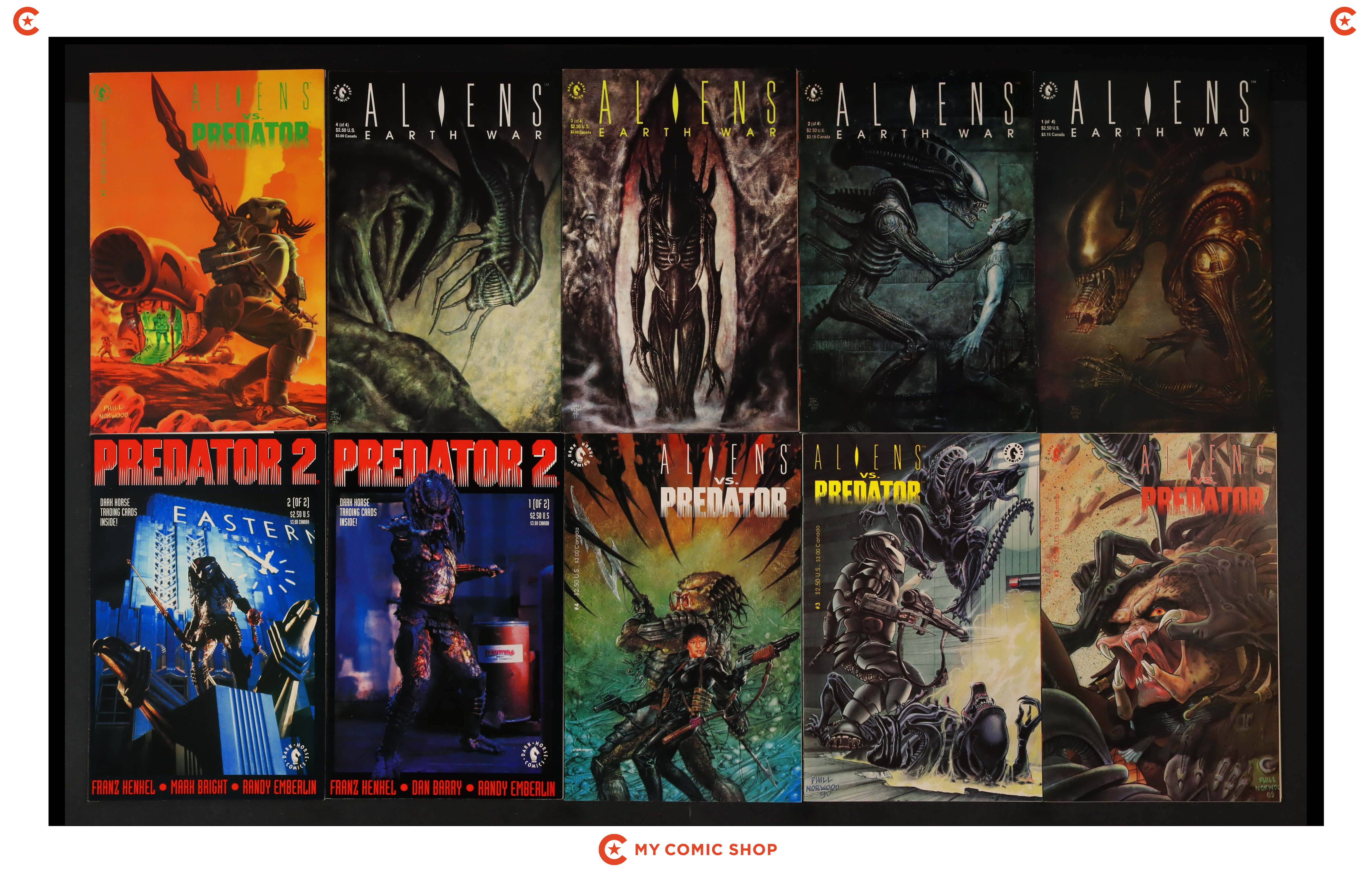 Issues 1-4 of Aliens Earth War (1990), issues 1-4 of Aliens vs. Predator (1990), and issues 1-2 of Predator 2 (1991 Movie Adaptation). Most will grade in the FN to VF range.