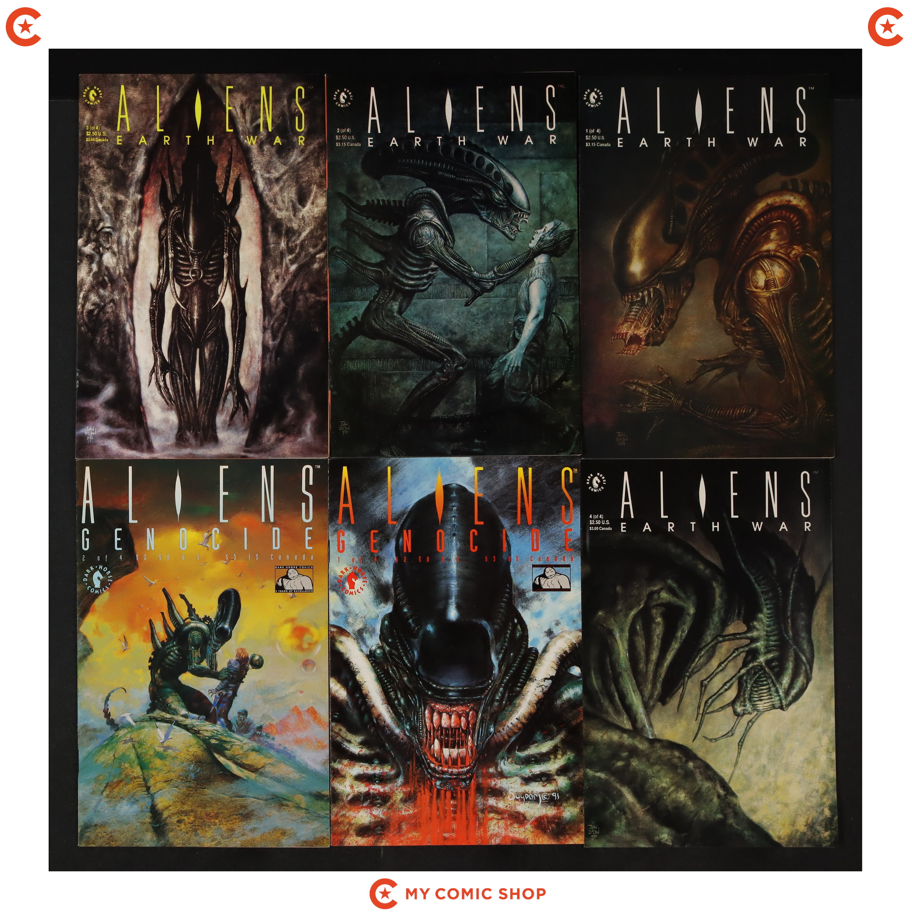 Issues 1-4 of Aliens Earth War (1990), issues 1-4 of Aliens Genocide (1991), and issues 1-4 of Aliens Xenogenesis (1999). Most will grade in the FN to VF range with #1, #2 of Aliens Earth War (1990) grading VG.