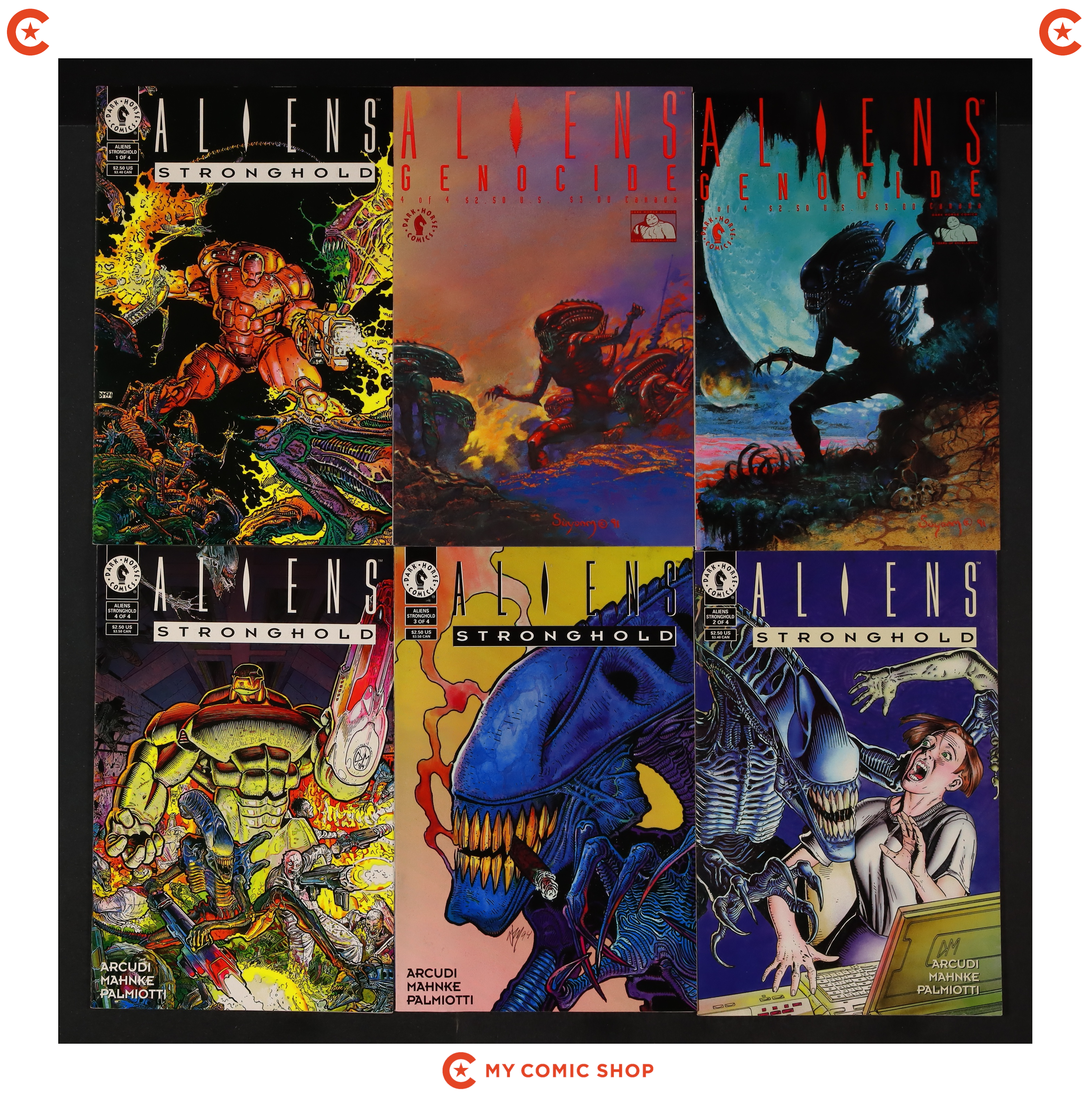 Issues 1-4 of Aliens Earth War (1990), issues 1-4 of Aliens Genocide (1991), and issues 1-4 of Aliens Stronghold (1994). Most will grade in the FN to VF range.