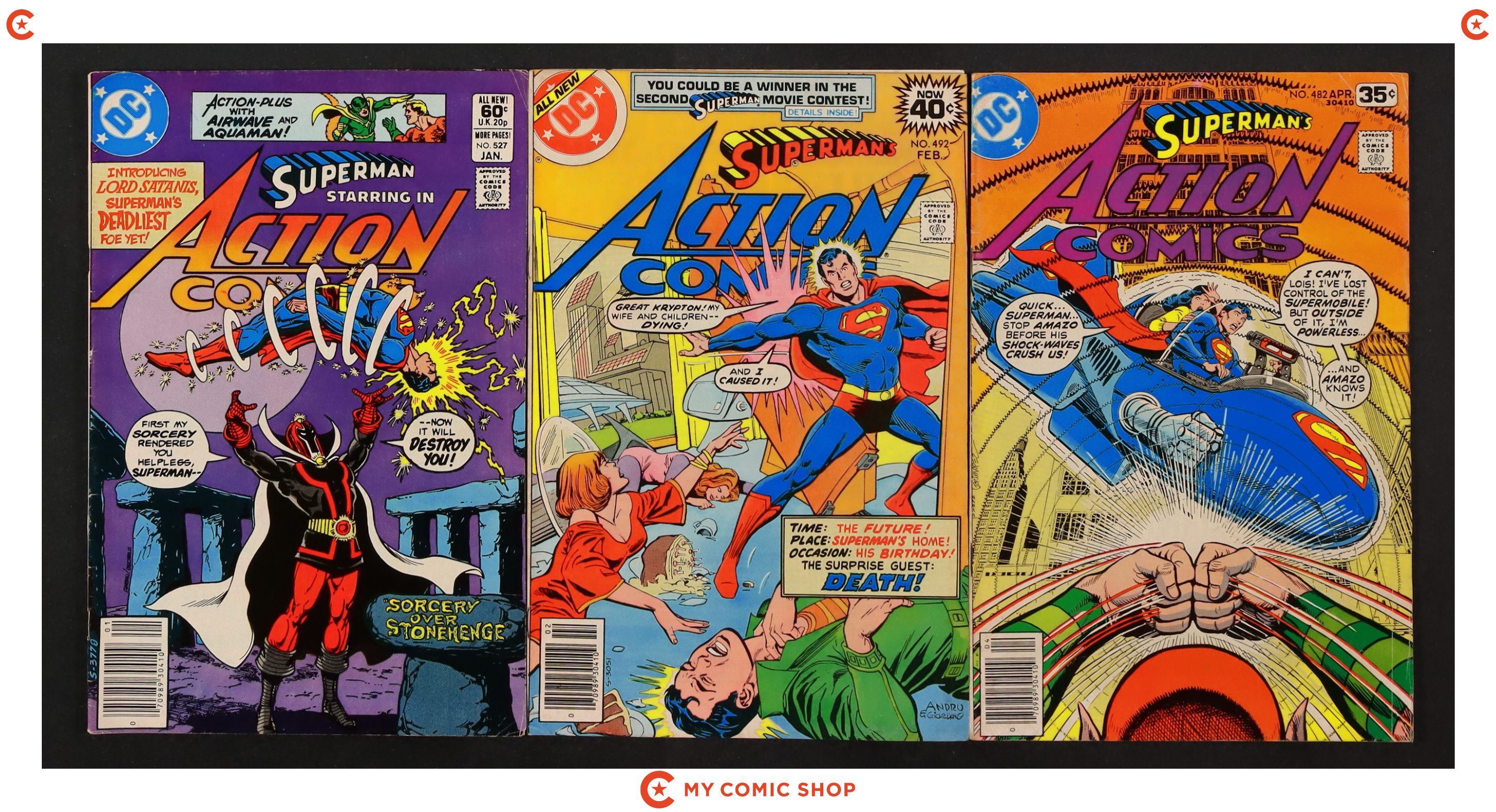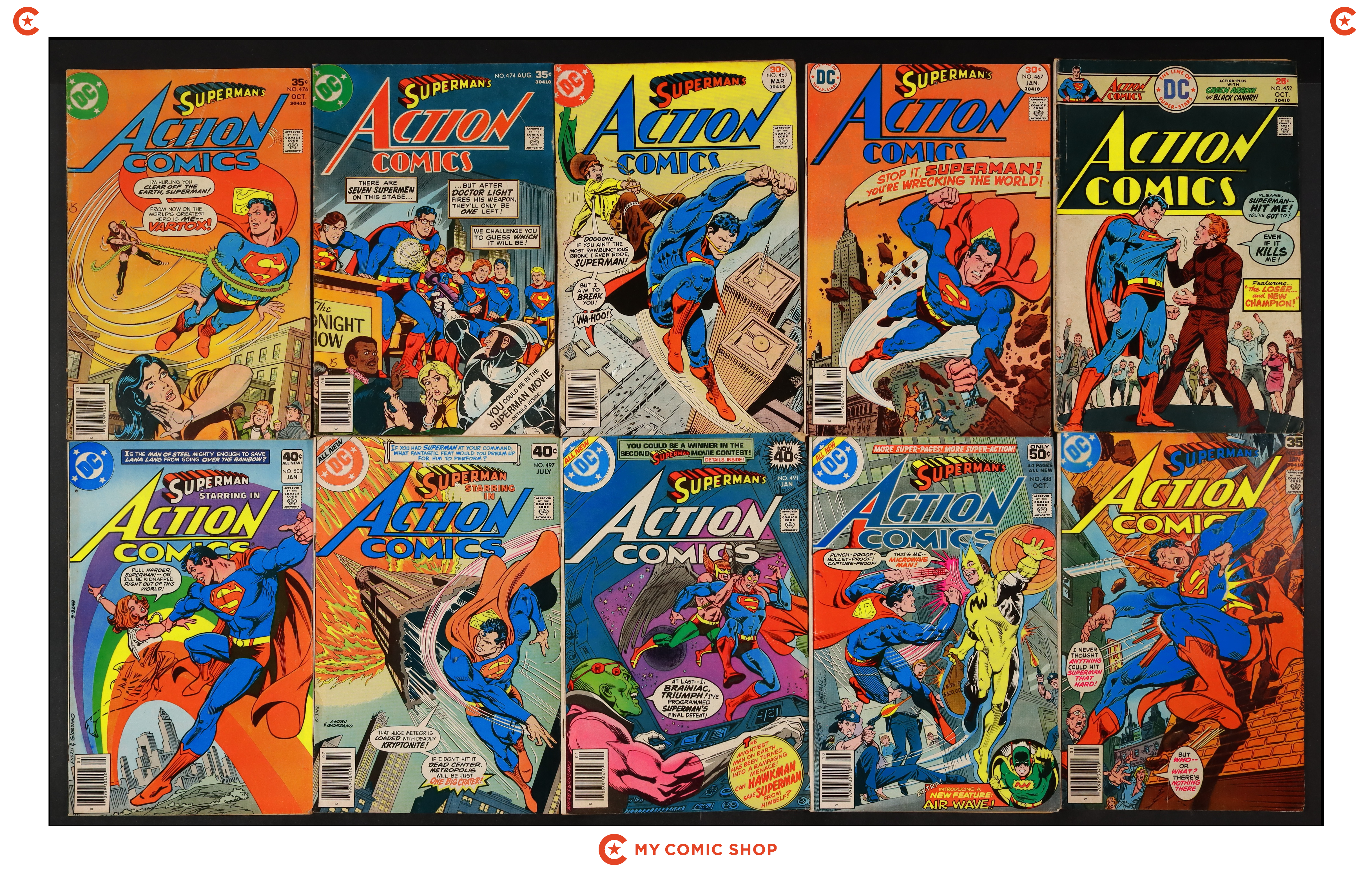 Issues 444, 454, 468, 471, 475, 478, 480, 495, 502, and 505 of Action Comics (1938 DC). Most will grade in the FN to VG range with #468 and #471 grading PR (centerfold missing, does not affect story or art).