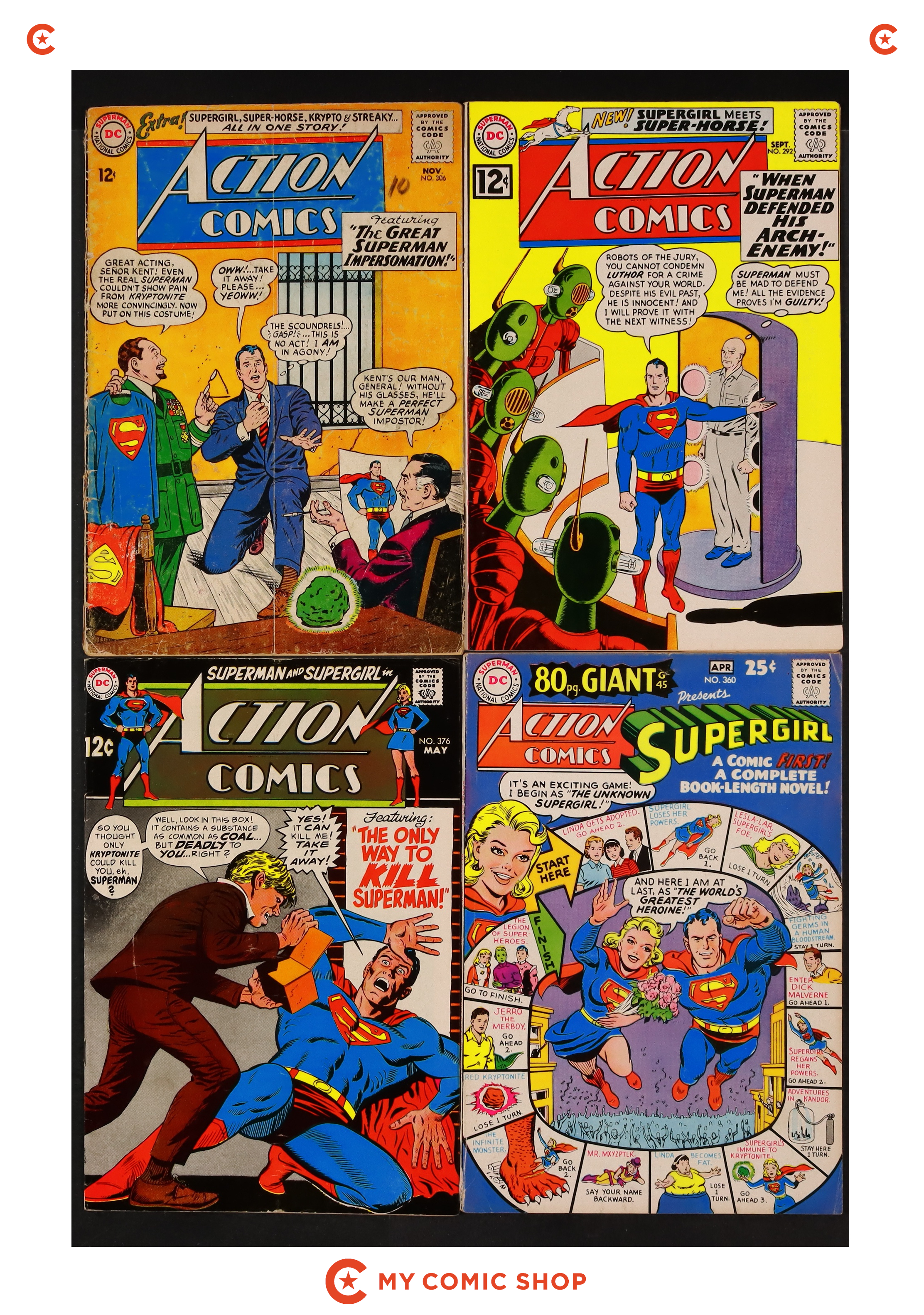 Issues 292, 306, 360, and 376 of Action Comics (1938 DC). Most will grade in the FN range with #306 grading GD and #376 grading PR (page missing, does not affect story or art).
