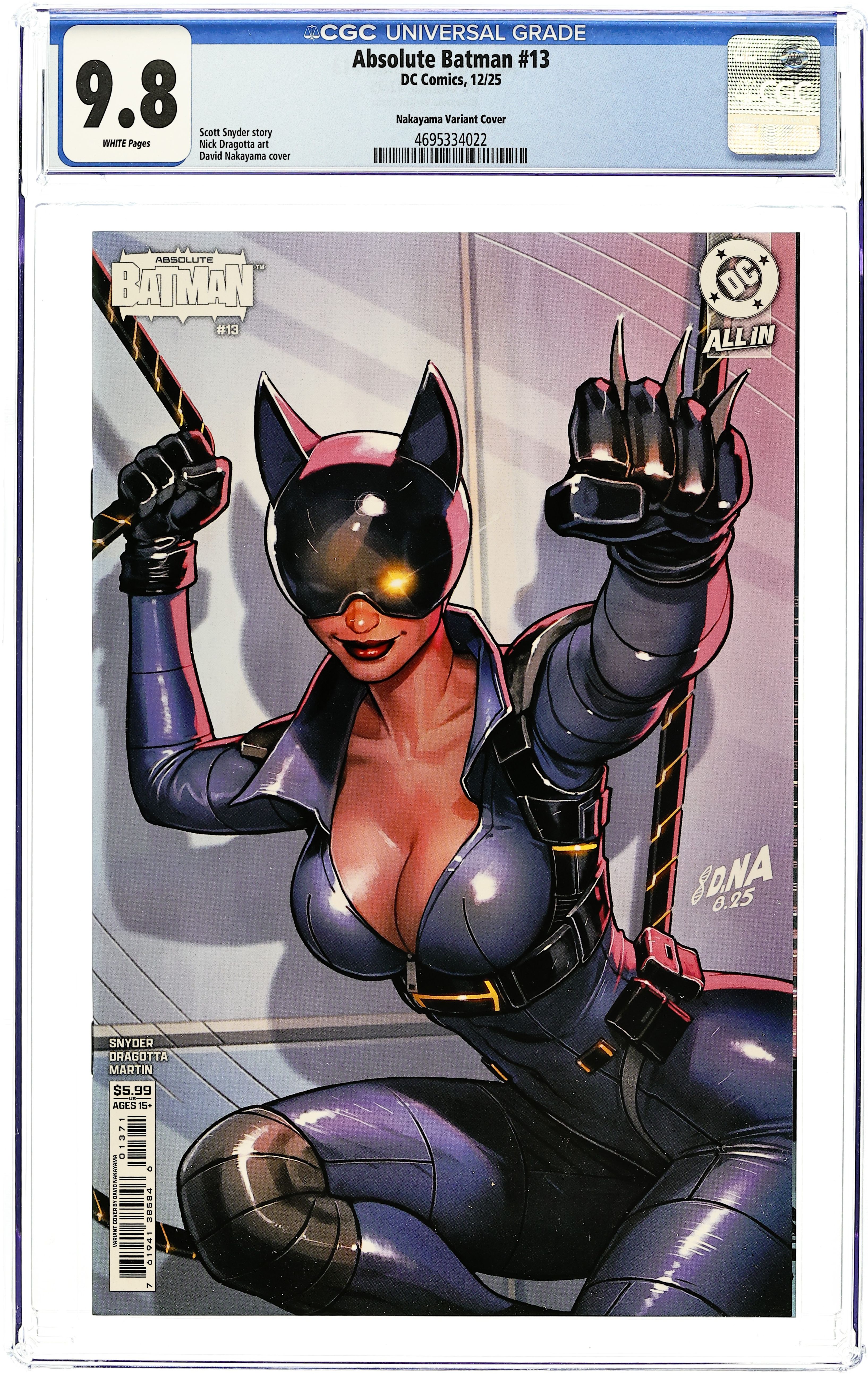 Starts Apr 4 Written by Scott Snyder. Art by Nick Dragotta. Cover by David Nakayama. ABSOLUTE CATWOMAN DEBUTS! Batmans final showdown with the monstrous Bane! Will he be able to overcome this unstoppable behemoth, or will he be trapped in Ark-M forever?! 24 pages, full color, rated 15+. Cover price $5.99.