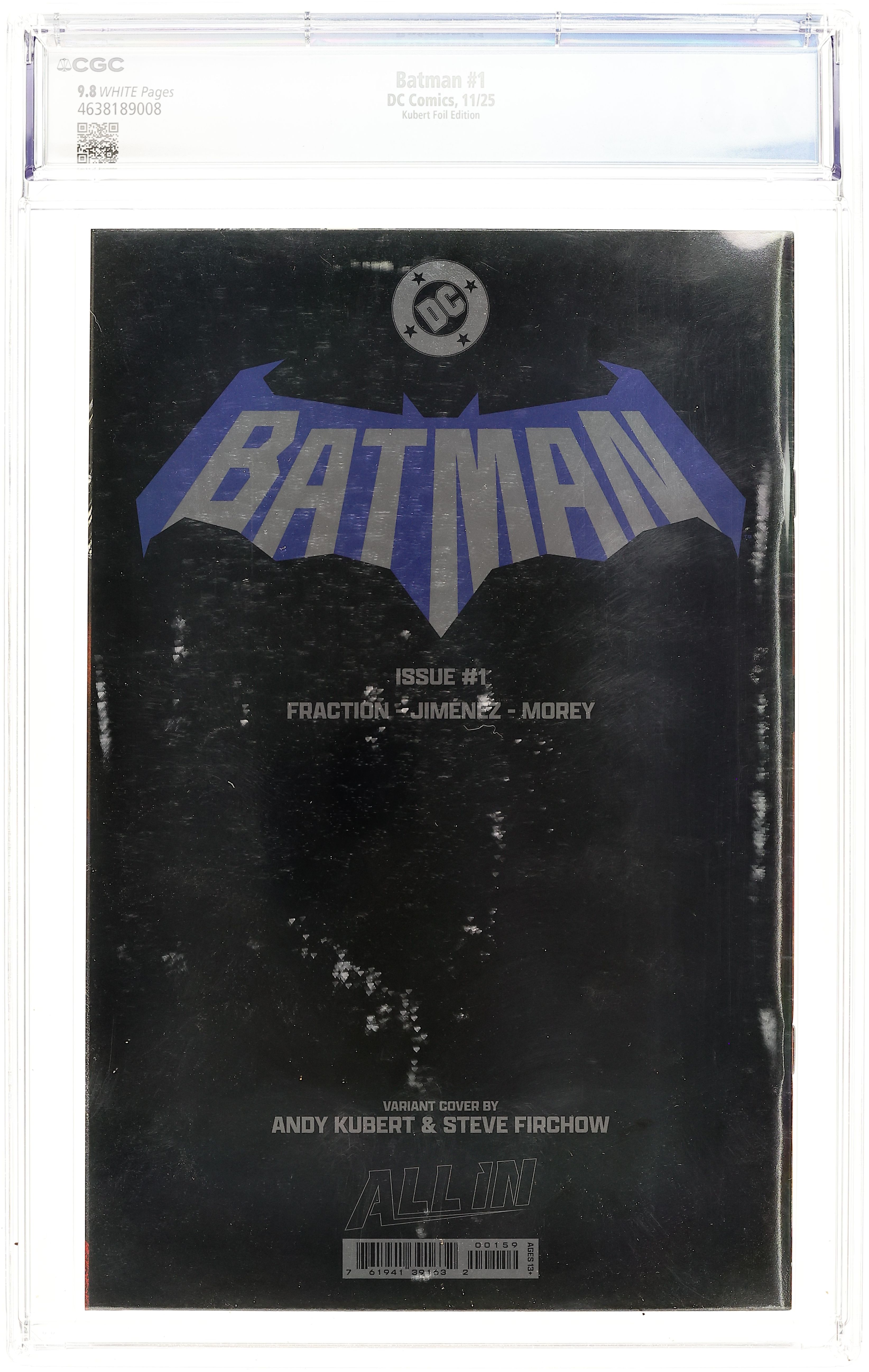 Starts Apr 20 Blind Bag Exclusive Foil Edition Virgin Cover by Andy Kubert. Written by Matt Fraction. Art by Jorge Jimenez. Cover by Andy Kubert. A BOLD NEW ERA OF BATMAN STARTS HERE! A new day dawns for the Dark Knight Detective as Eisner Award-winning writer Matt Fraction (Hawkeye, Superman's Pal Jimmy Olsen) joins forces with superstar artist Jorge Jimenez (Batman, Summer of Superman Special) for an unforgettable new era of Batman! The best superhero in comics gets a brand-new first issue to kick off this new era that will test Batman and Bruce Wayne like never before! 40 pages, full color. Rated T+ Cover price $5.99.