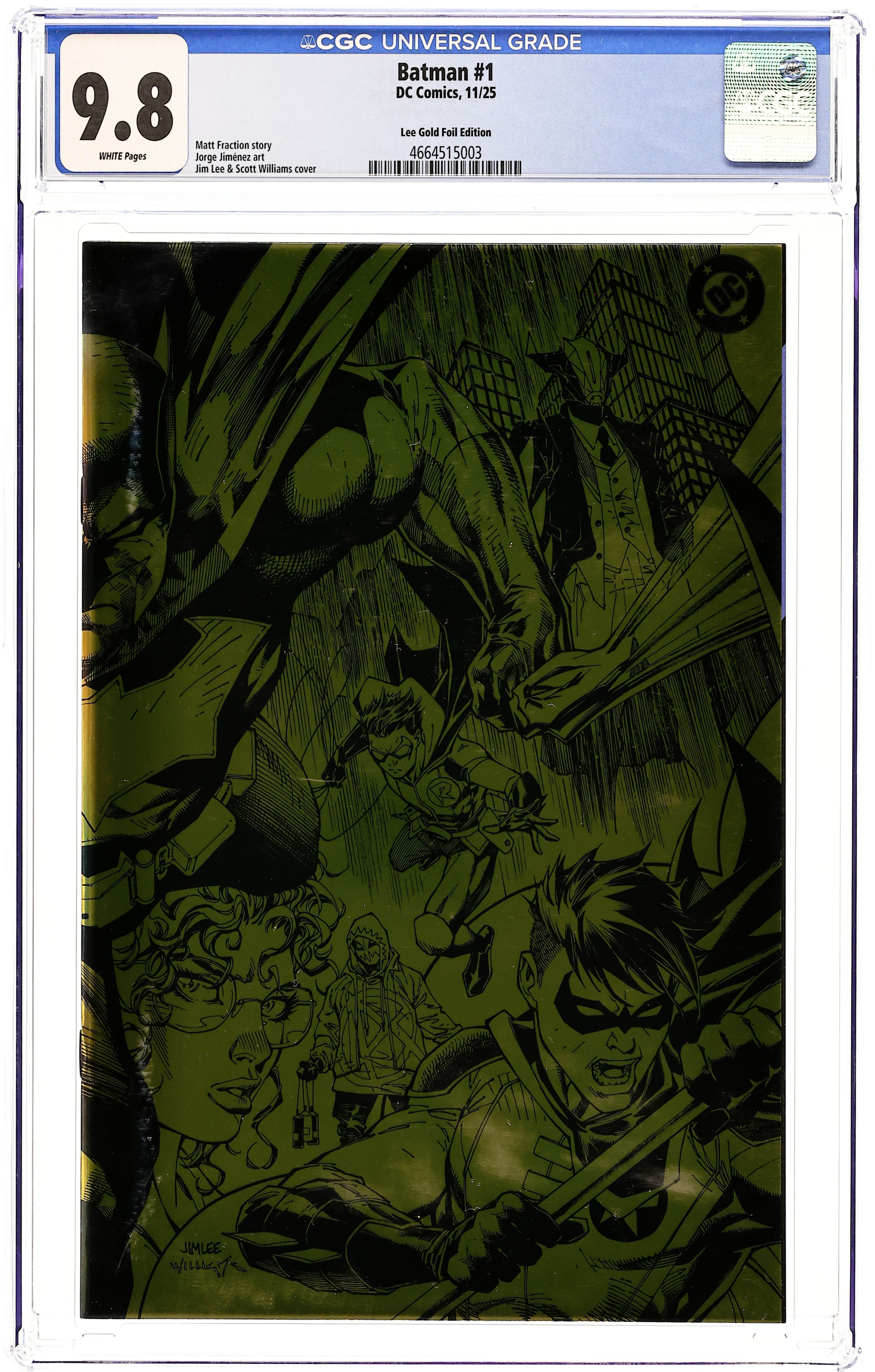 Starts Apr 4 Blind Bag Exclusive 1:500 Gold Foil Variant Cover by Jim Lee. Written by Matt Fraction. Art by Jorge Jimenez. A BOLD NEW ERA OF BATMAN STARTS HERE! A new day dawns for the Dark Knight Detective as Eisner Award-winning writer Matt Fraction (Hawkeye, Superman's Pal Jimmy Olsen) joins forces with superstar artist Jorge Jimenez (Batman, Summer of Superman Special) for an unforgettable new era of Batman! The best superhero in comics gets a brand-new first issue to kick off this new era that will test Batman and Bruce Wayne like never before! 40 pages, full color. Rated T+