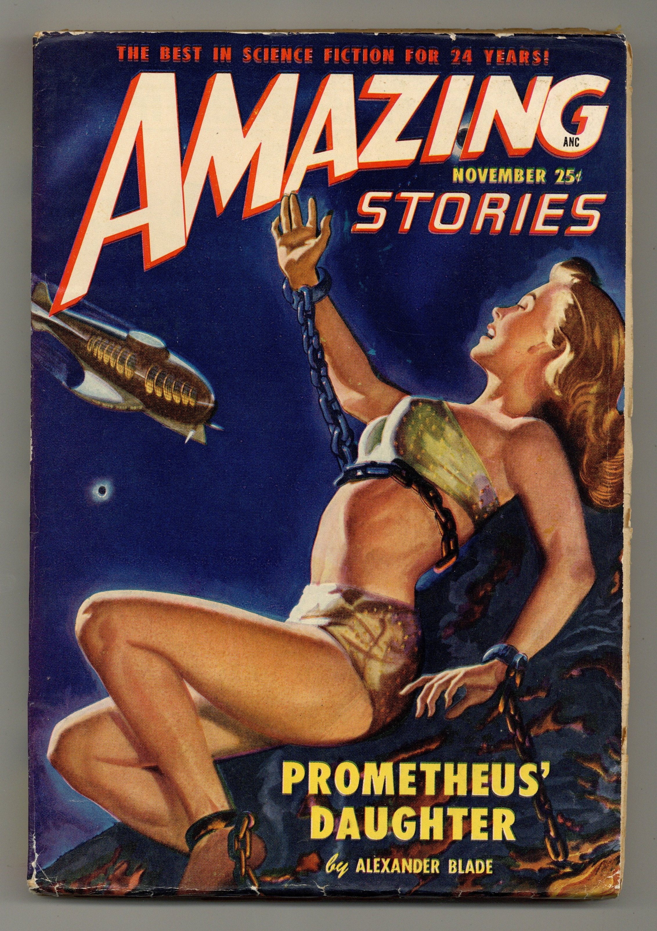 Starts Apr 4 Volume 23, Issue 11 - November, 1949. Cover by Arnold Kohn, depicting a scene from "Prometheus' Daughter" by Alexander Blade. Stories by Alexander Blade, Rog Phillips, Richard S. Shaver & Chester S. Geier, Berkeley Livingston and Norma Laxell Easton. Illustrations by Arnold Kohn, Julian S. Krupa, J. Allen St. John, Leo Ramon Summers and Bill Terry. Stories: "Prometheus' Daughter" by Alexander Blade, illustrated by Arnold Kohn; "Beyond the Matrix of Time" by Rog Phillips, illustrated by Julian S. Krupa; "Battle in Eternity" by Richard S. Shaver & Chester S. Geier, illustrated by J. Allen St. John; "Mr. Jones' Eternal Camera" by Berkeley Livingston, illustrated by Leo Ramon Summers; and "The Avenger" by Norma Laxell Easton, illustrated by Bill Terry. Features: The Observatory; Maybe It's True; Radioactive Railroad; Sinister Blackout; Electric Muscles; The Ancient Geometrical Monument; Floating on Air; and more. 7-in. x 10-in., 160 newsprint pages, B&W. Cover price $0.25.