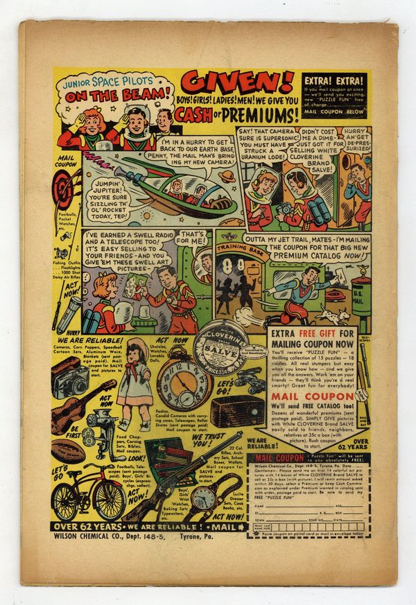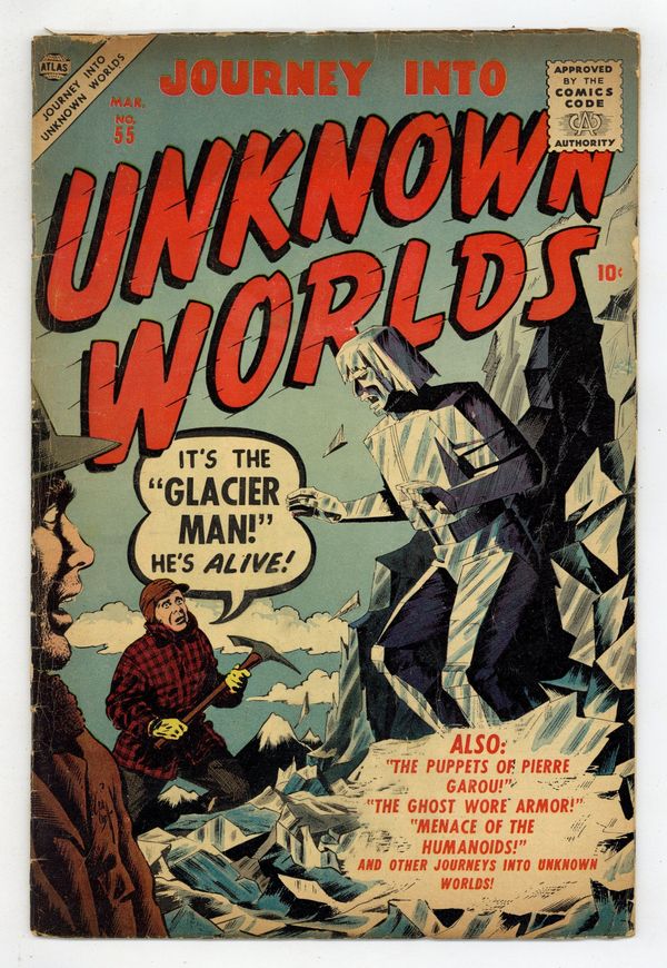 Starts Jan 26 Cover art by Bill Everett. Menace of the Humanoids, art by Don Heck; An engineer building the first satellite finds himself attacked by thugs in humanoid costumes. King of the Glacier Men, pencils by Al Williamson, inks by Ralph Mayo; A European dictator is exiled to the North where he becomes king of the glacier men. The Men in the Mole!, art by John Forte; Three men in a mole-like drilling device find a world underground populated by sorcerers. The Ghost Wore Armor, pencils by Bob Forgione, inks by Jack Abel; An explorer looks to steal golden armor from the natives. Lost in Time text story. Shangri-La, art by Bill Everett; A man makes it back from Shangri-La only to be informed that the man he spoke with, whom he takes to be mad, actually left for the valley four hundred years ago. The Puppets of Pierre Garou, art by Reed Crandall; A puppeteer shrinks people who try to rob him and uses them in his show. 36 pgs. $0.10. Cover price $0.10.