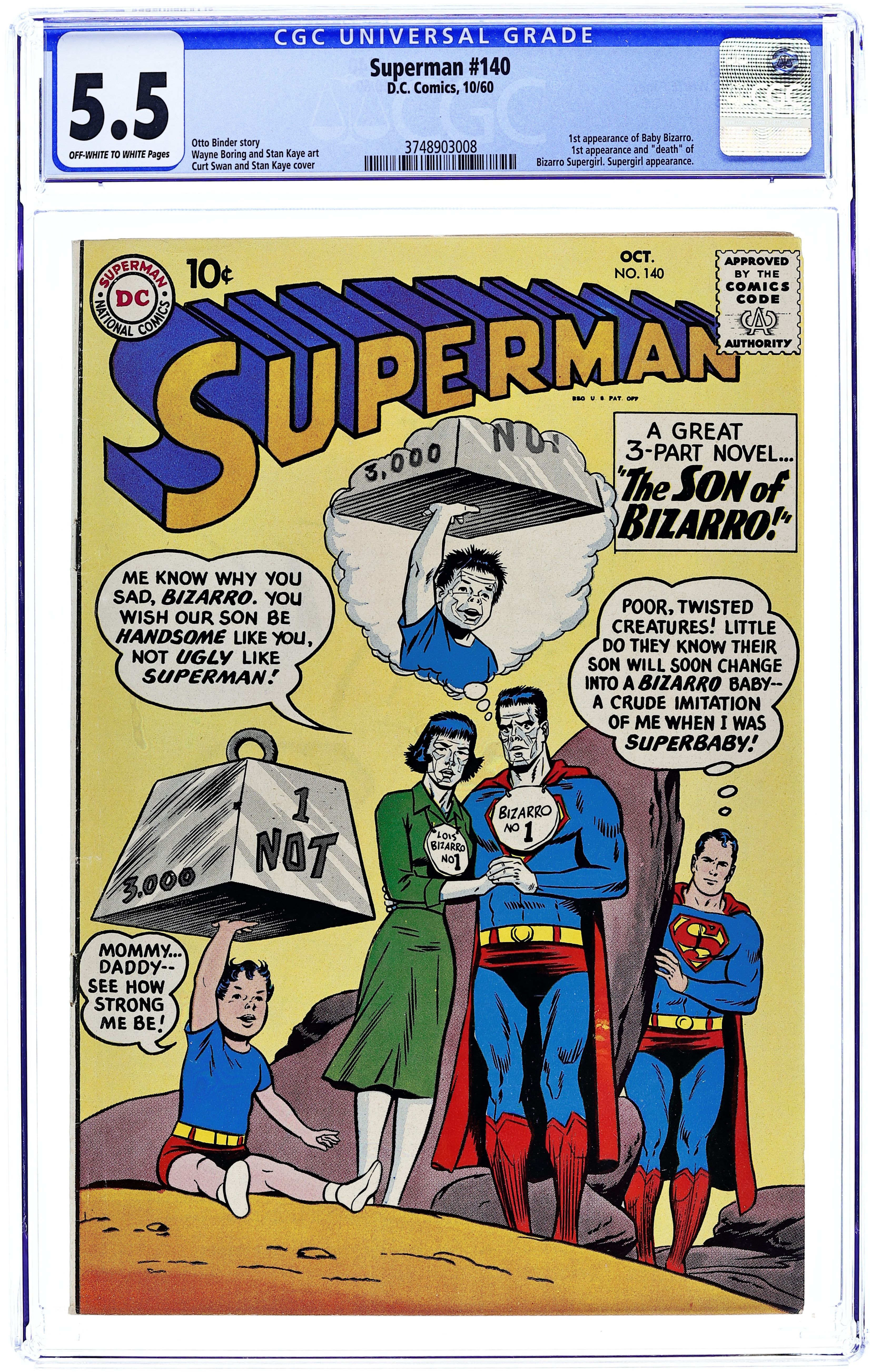 Starts Dec 22 1st appearance of Blue Kryptonite and Bizarro Supergirl. Cover pencils by Curt Swan, inks by Stan Kaye. The Son of Bizarro! [Part 1], script by Otto Binder, pencils by Wayne Boring, inks by Stan Kaye; Bizarro-Lois gives birth to Bizarro-Jr. No. 1. Dexter humor page by Henry Boltinoff. The "Orphan" Bizarro! [part 2]; Linda Lee is assigned to watch the newly named baby Buster. The Bizarro Supergirl! [part 3]; Bizarro-Jr. finds Lex's original Imperfect Duplicator while playing in the Fortress of Solitude and creates a Bizarro-Supergirl. 36 Pages, Full Color. Cover price $0.10.