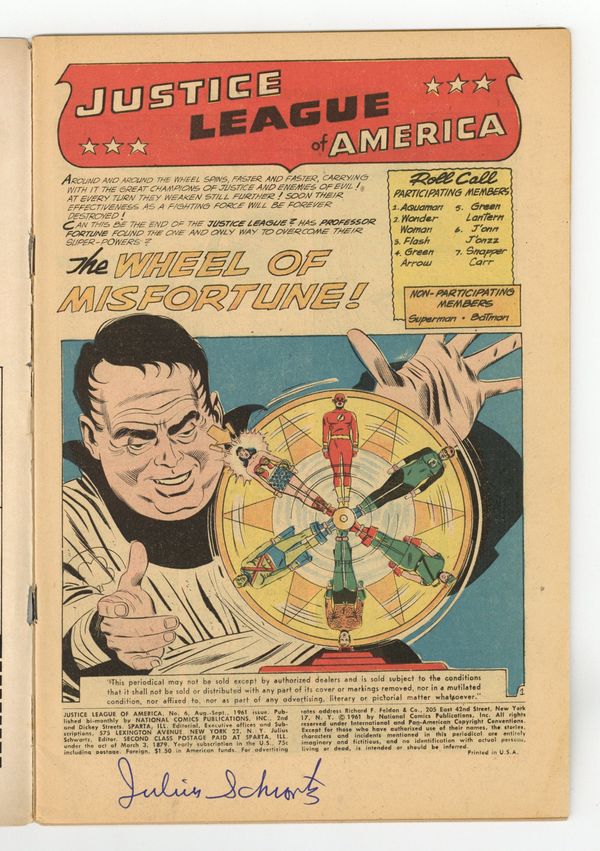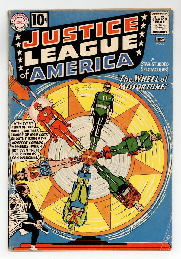 Starts Jan 26 Cover pencils by Mike Sekowsky, inks by Murphy Anderson. The Wheel of Misfortune!, script by Gardner Fox, pencils by Mike Sekowsky, inks by Bernard Sachs; Professor Amos Fortune has found a way to control luck itself with his Stimoluck device, and the Justice League must find a way to overcome his unnaturally good luck while dealing with their own unnaturally bad luck. 36 pgs. $0.10. Cover price $0.10.
