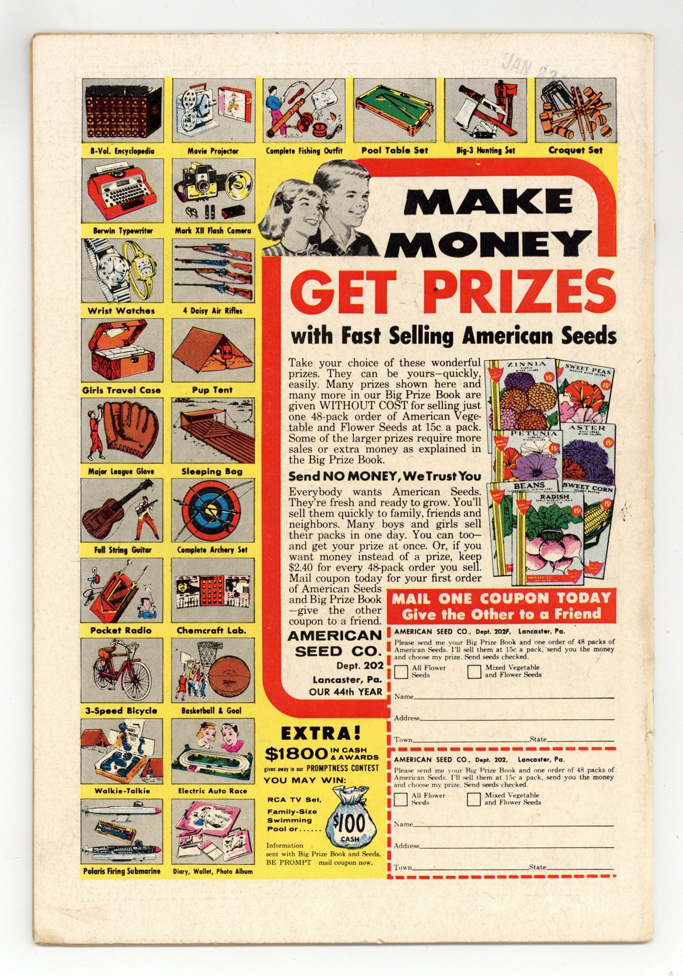 Starts Jan 3 Cover pencils by Carmine Infantino, inks by Joe Giella. The Reign of the Super-Gorilla!, script by John Broome, pencils by Carmine Infantino, inks by Joe Giella; Grodd falls in love with Boka, a female gorilla, but Boka is set to marry Solovar; Grodd uses neo-magnetic radiation to make everyone love him; Boka becomes Grodds queen, and he rules Gorilla City. The Mystery of the Troubled Boy!, script by John Broome, pencils by Carmine Infantino, inks by Joe Giella; Wally searches for his friend Tommy Elkins, who has skipped school and is missing. Amazing Speeds fact page. 36 Pages, Full Color. Cover price $0.12.