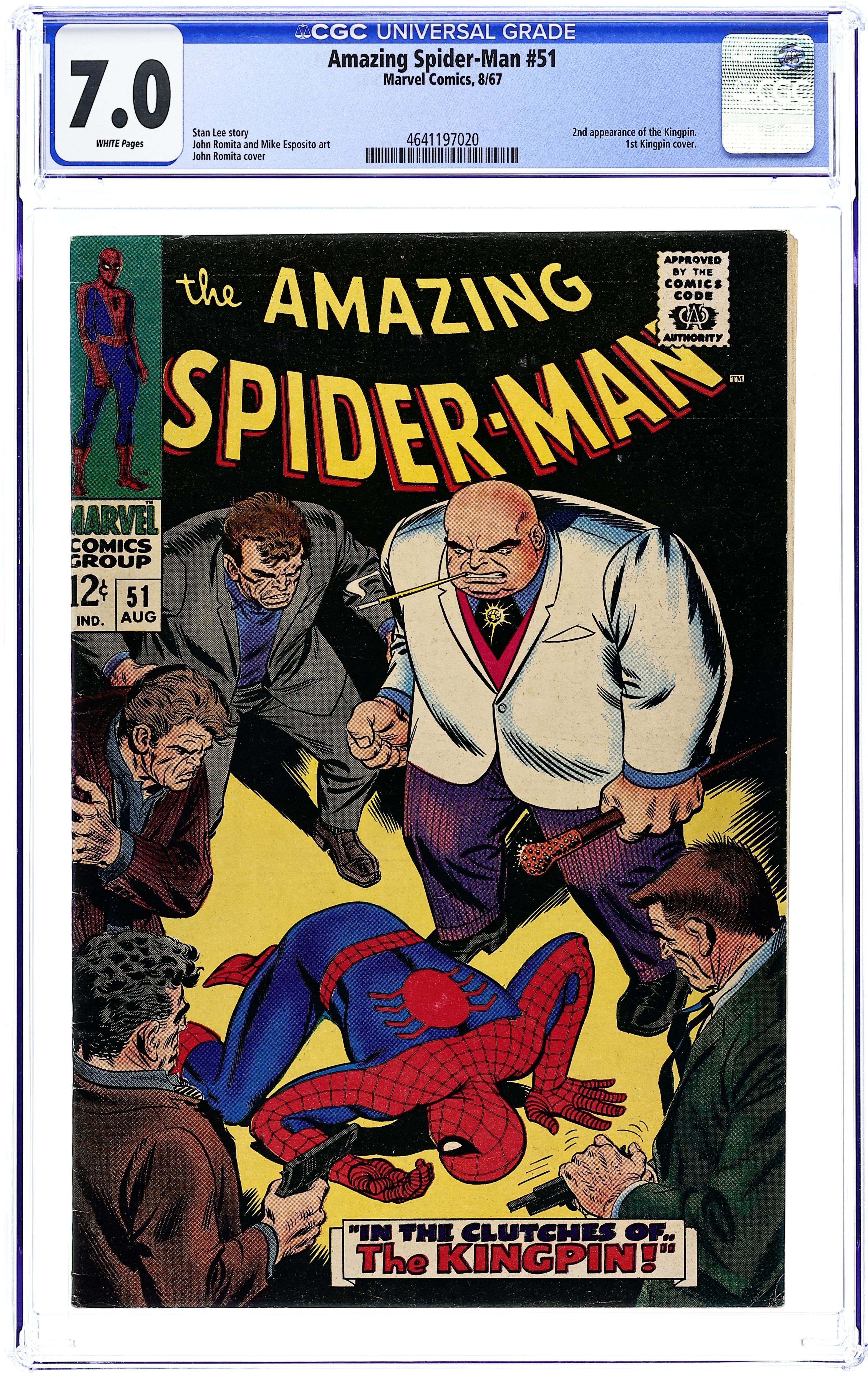 Ends Dec 15 7:13 PM CST Bid History no bids Minimum Bid $1 Your Secret Max Bid If you'd like to bid, please log in or register. Cover by John Romita Sr. Second appearance of the Kingpin in In the Clutches of...the Kingpin!, script by Stan Lee, pencils by John Romita, inks by Mike Esposito (as Mickey Demeo); When the Kingpin orders that J. Jonah Jameson be silenced for his negative press on Fisk's illegal activites, Spidey swings in to save the EIC; But can the Wallcrawler take the big guy in a one-on-one brawl? Reprinted in Marvel Tales # 36. 36 pages, full color. Cover price $0.12.
