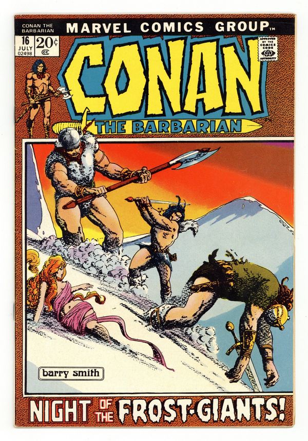 Starts Dec 22 Cover art by Barry Windsor-Smith. The Frost Giant's Daughter, script by Roy Thomas, art by Barry Windsor-Smith; setting: Snowy battlefield; Conan chases Atali across the snow, slays her two frost giant brothers, and catches her; Her father, Ymir then takes her from Conan. This story originally appeared in Savage Tales 1, but for its publication here Windsor-Smith added another page (a new splash page), and some panels and dialogue were altered for Comics Code approval. Back-up reprint story: The Sword and the Sorcerers (from Chamber of Darkness 4), script by Roy Thomas, art by Windsor-Smith. Also in this issue: a full-page reprint of the Hyborian Age map from Conan 1. 36 pgs. Cover price $0.20. Cover price $0.20.