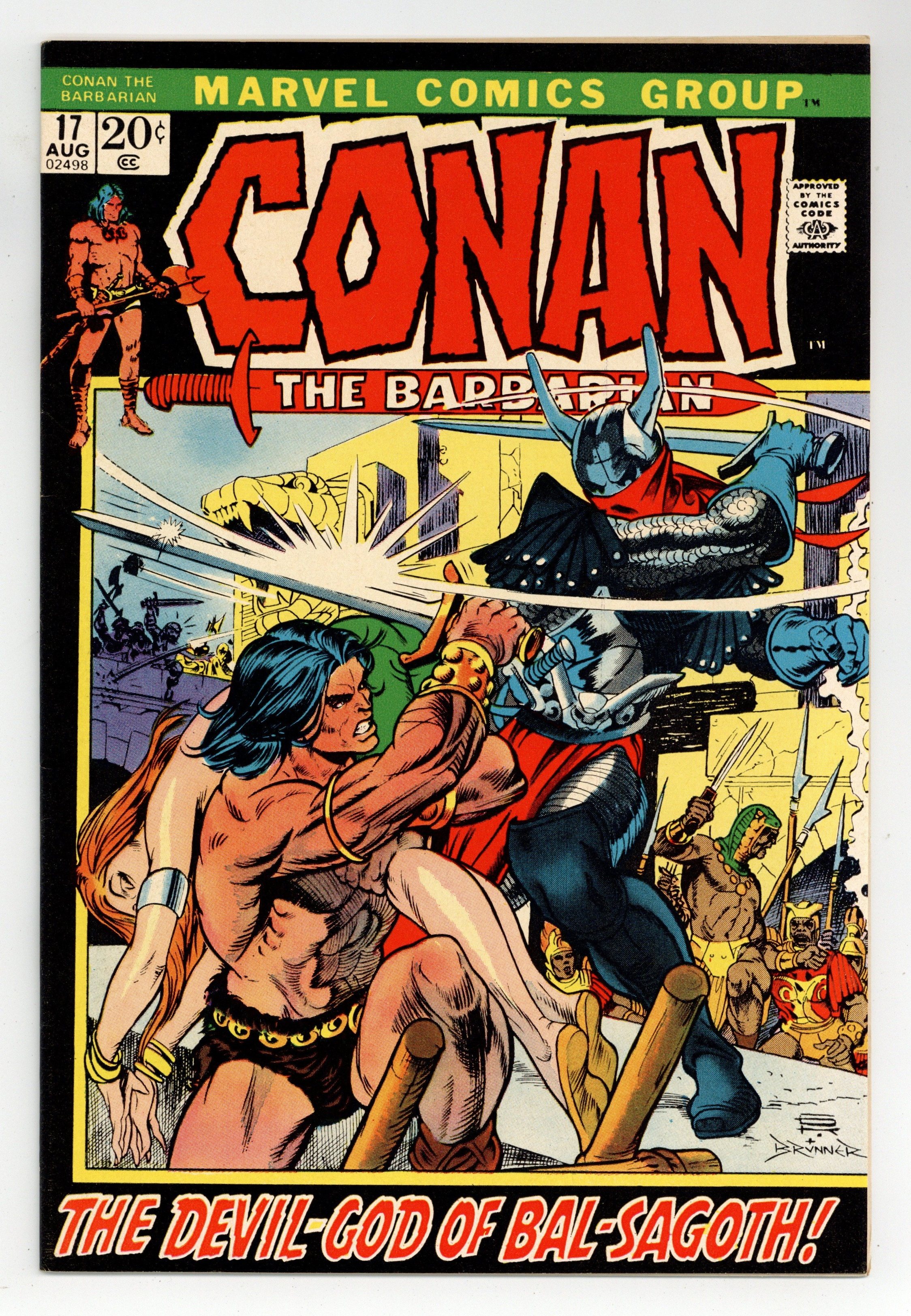 Starts Mar 23 Cover art by Gil Kane and Frank Brunner. The Gods of Bal-Sagoth, script by Roy Thomas, pencils by Gil Kane, inks by Ralph Reese; setting: Ship in the Vilayet Sea, Island city of Bal-Sagoth; Conan saves Kyrie and restores her as queen of Bal-Sagoth.Adapted from the non-Conan (Turlogh O'Brien) story by Robert E. Howard; Fafnir appearance. Letter to the editor from comic writer Marc DeMatteis. The letters page also contains the nominations for the 1971 Shazam awards (the Academy of Comic Book Arts, or the ACBA). Kane cover pencils, Frank Brunner cover inks. 36 pgs. Cover price $0.20. Cover price $0.20.