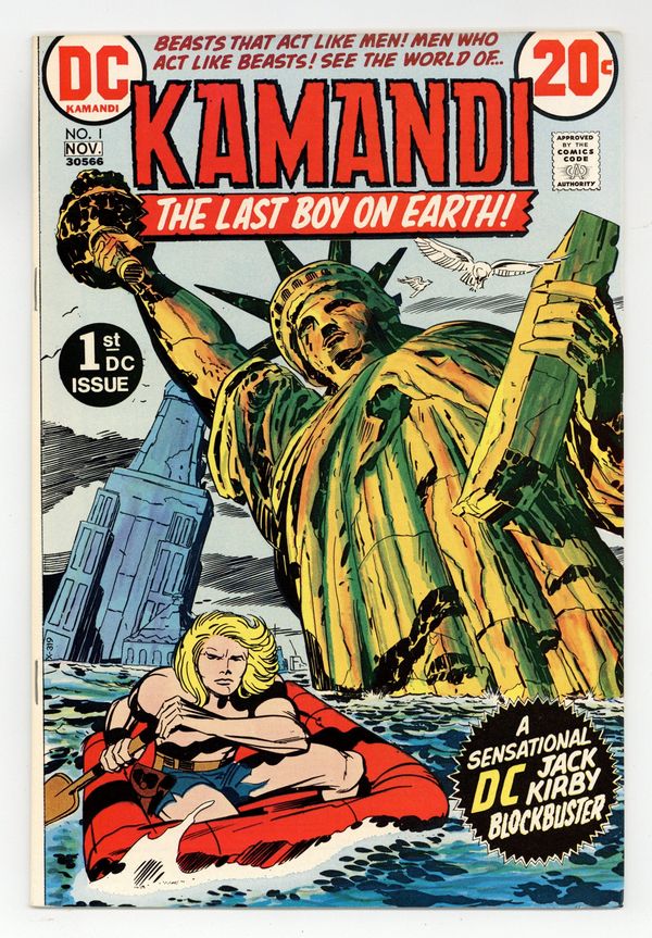 Starts Jan 26 1st appearance and origin of Kamandi. "The Last Boy on Earth." Script and pencils by Jack Kirby, inks by Mike Royer. Cover by Kirby and Royer. A series that borrows many concepts from Planet of the Apes, Kamandi takes place in an alternate future where animals have mutated into bipedal beings of intelligence and where humans are treated like savage beasts. Kamandi avenges the death of his grandfather, who was killed by wolves, but is then captured by a tiger named Caesar, who turns him over to dog-scientist Dr. Canus. Canus proceeds to help Kamandi, and this is where the so-called last boy on earth hooks up with Ben Boxer, a mutated human who can turn to living metal. Cover price $0.20.