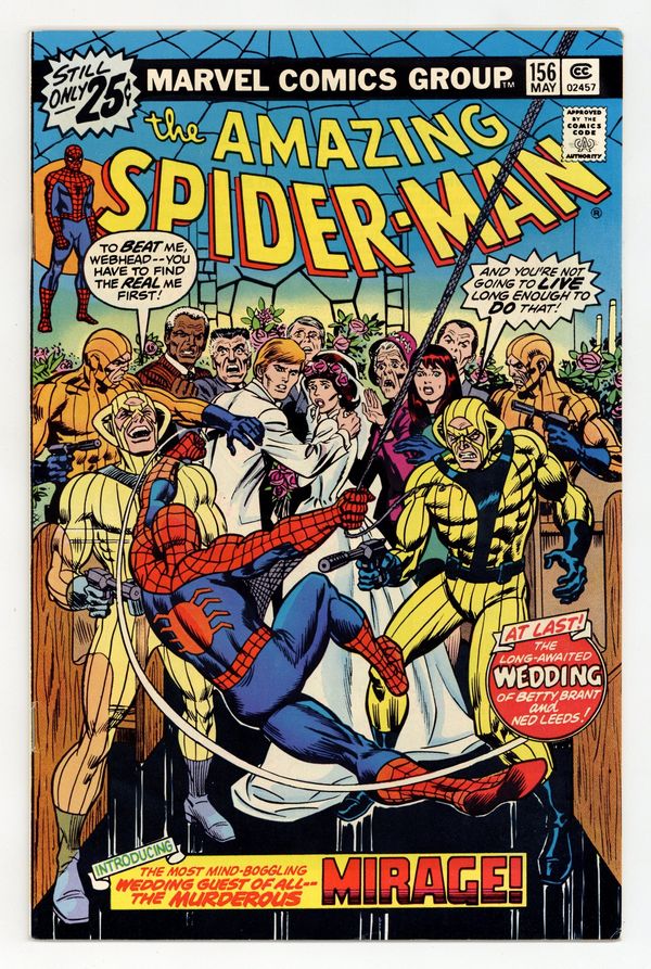 Starts Feb 2 "On a Clear Day, You Can See...The Mirage!" Script by Len Wein. Pencils by Ross Andru. Inks by Mike Esposito and Dave Hunt (backgrounds). Cover by John Romita. Wedding bells ring in the pages of the Amazing Spider-Man! As Peter's former girlfriend (Betty Brant) and the web-slinger's future foe (Ned Leeds aka the Hobgoblin) tie the knot! The joyous ceremony proceeds as planned until a wedding crasher shows up! The Mirage! And he's not just looking for free hors d'oeuvres! Can the wall-crawler see through the Mirage and restore Betty and Ned's happy day? First Appearance of the Mirage. Appearances by Aunt May, Anna Watson, Mary Jane Watson, Flash Thompson, Harry Osborn, Liz Allan, J. Jonah Jameson, Joe Robertson, and Doctor Octopus. (Notes: The Mirage appears next in Marvel Two-in-One 96. The letters page includes Marvel Value Stamp series B #83 the Incredible Hulk. This story was reprinted in Marvel Tales 133. A 30-cent cover price variant exists for this issue.) 36 pages. Cover price $0.25.