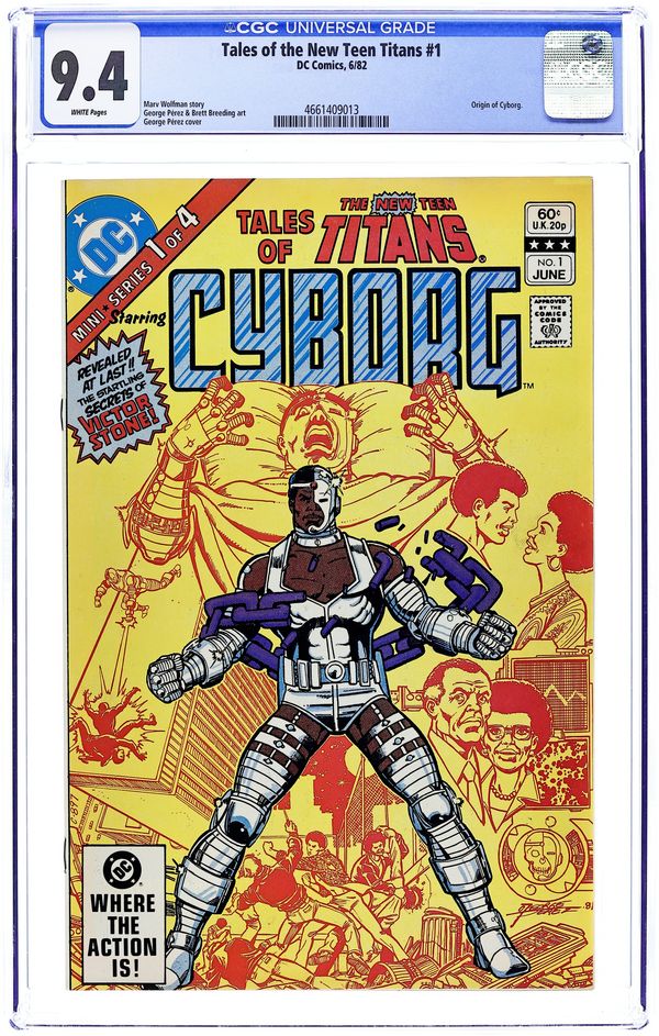 Starts Feb 2 Direct Edition. Script by Marv Wolfman, pencils by George Perez, embellishes by Brett Breeding. Cyborg pin-up by Perez. Cover by Perez. Victor Stone tells the other Titans about his past, relating his animosity towards his father, running with the wrong crowd, and the events that turned him into "Cyborg." 25-page tale. Appearances by Robin, Wonder Girl, Kid Flash, Starfire, Changeling, Raven. Cover price $0.60.
