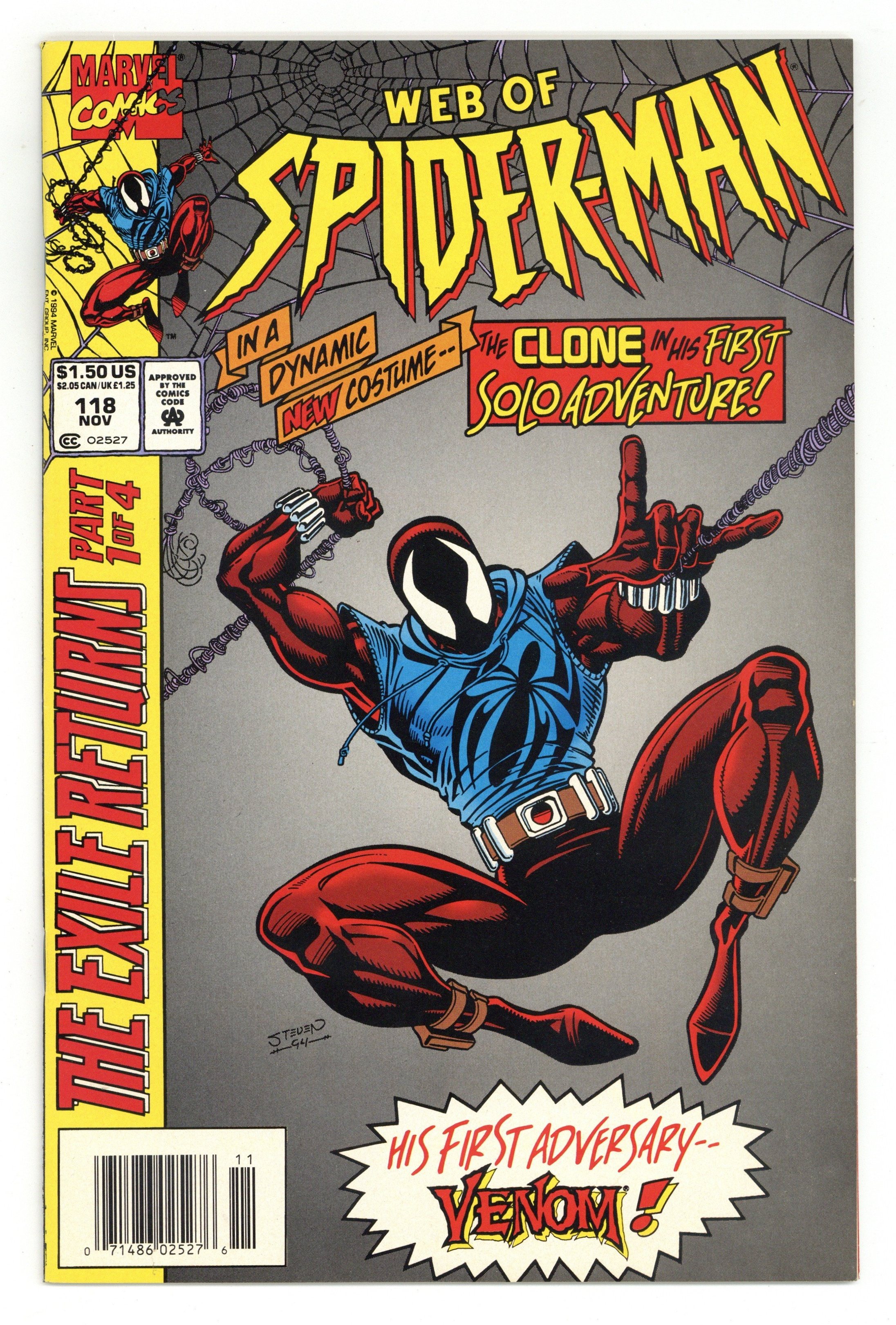 Starts Apr 27 First Printing. Newsstand Edition. "Exiles Return Part 1 of 4: Memories" Written by Terry Kavanagh. Pencils by Steve Butle. Inks by Randy Emberlin. Venom and Clone appear. Note: First appearance of Ben Reilly as the Scarlet Spider. Cover price $1.50.