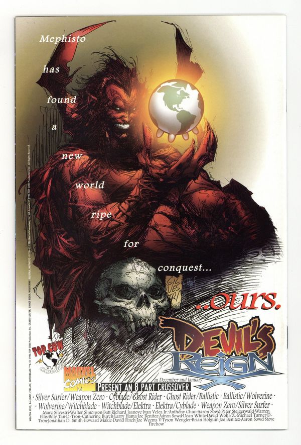 Starts Apr 27 Direct Edition. Standard Cover by Michal Turner and D-Tron. 1st appearance of The Darkness. Cover pencils by Michael Turner, inks by D-Tron. Witchblade & The Darkness, script by Marc Silvestri (Co-Plot), Christina Z, and David Wohl, pencils by Michael Turner (pgs. 1-6, 11-22) and Marc Silvestri (pgs. 7-10), inks by D-Tron (pgs. 1-6, 11-22), Matt Banning (pgs. 7-10), Jose Guillen (Assistant), Viet Truong (Assistant), and Jeff Crumpler (Assistant); Mob enforcer Jackie Estacado enters Sara's life and when she tries to bring him down, the Witchblade doesn't want to cooperate. The Witchblade & The Darkness Pin-Up, pencils by Billy Tan Mung Khoy, inks by D-Tron. 36 pgs. $2.50. Cover price $2.50.