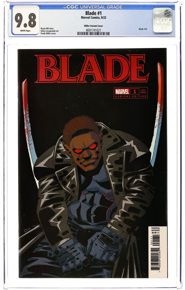 Starts Apr 20 Written by Bryan Hill. Art by Elena Casagrande. Cover by Frank Miller. Marvel's slickest vampire hunter returns in a brand new ongoing by Bryan Hill (KILLMONGER) and Elena Casagrande (BLACK WIDOW)! True evil is patient. And a dark, ancient power has been simmering quietly for centuries…and when Blade himself is the one to unknowingly unleash it, Marvel's entire supernatural underworld will come out of hiding to demand he handle it. Or pay a pound of flesh for his mistakes. Bloodbaths, blackmail and Blade - you won't want to miss the explosive first issue of this new volume! 40 pages, full color. Rated Parental Advisory Cover price $4.99.