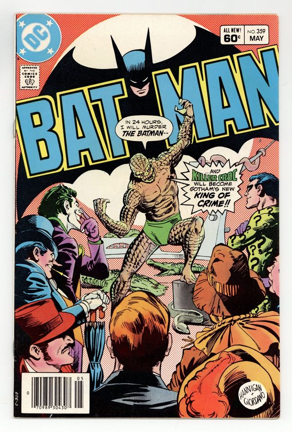 Starts Jan 26 Newsstand Edition. Cover pencils by Ed Hannigan, inks by Dick Giordano. Jason Todd becomes a continuing character in "Hunt" starring Batman, Dick Grayson, Jason Todd, James Gordon, Vicki Vale, Alfred Pennyworth, Waldo Flynn, Trina Todd, Joe Todd, and Killer Croc, script by Gerry Conway, pencils by Dan Jurgens, inks by Dick Giordano; Featuring the origin of Killer Croc!; Batman searches for the whereabouts of Killer Croc while Croc himself breaks into Gotham City Jail to take care of the last obstacle in his path toward ruling the Gotham Underground. 1st comic book work by Dan Jurgens. 36 Pages, Full Color. Cover price $0.60.