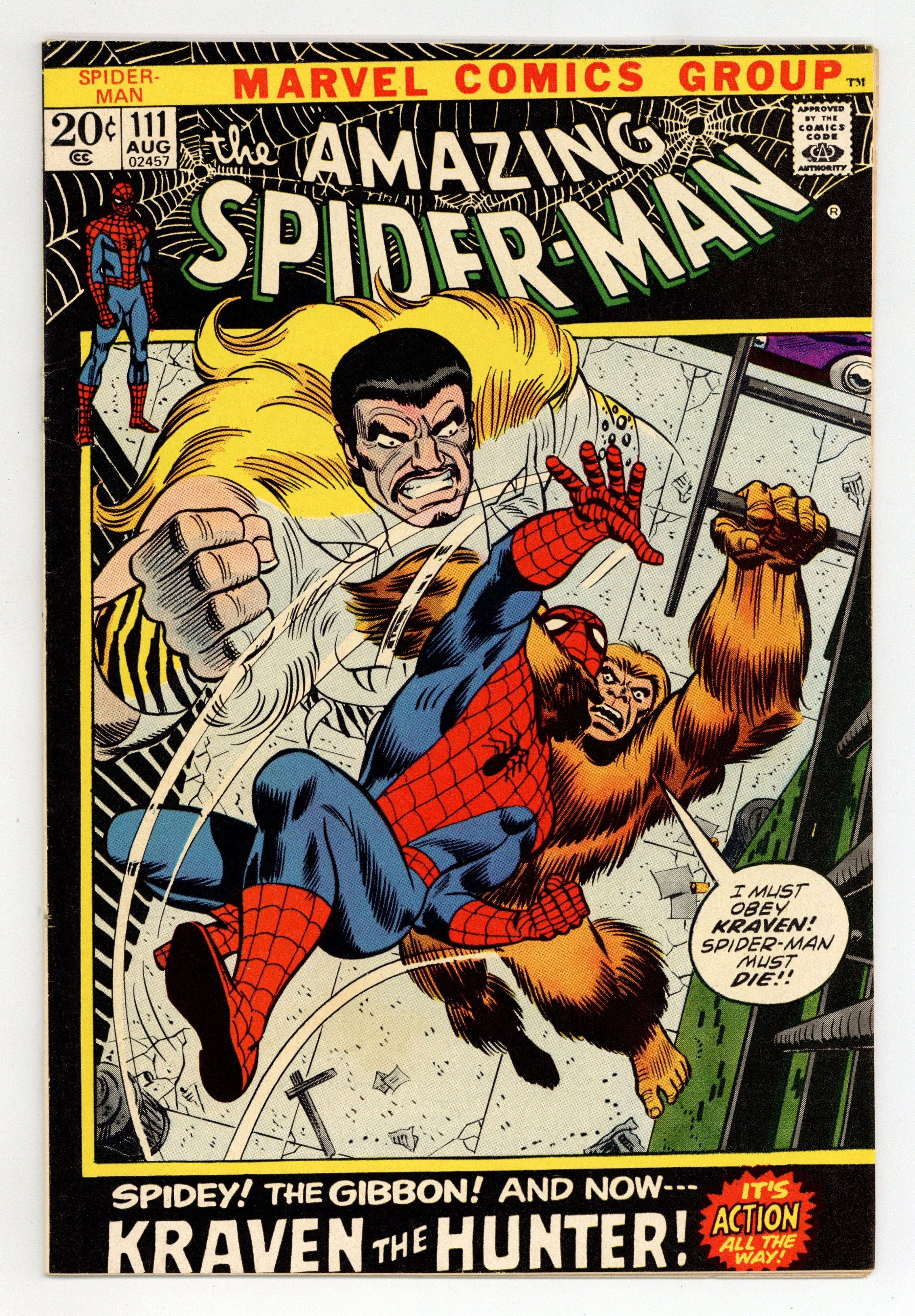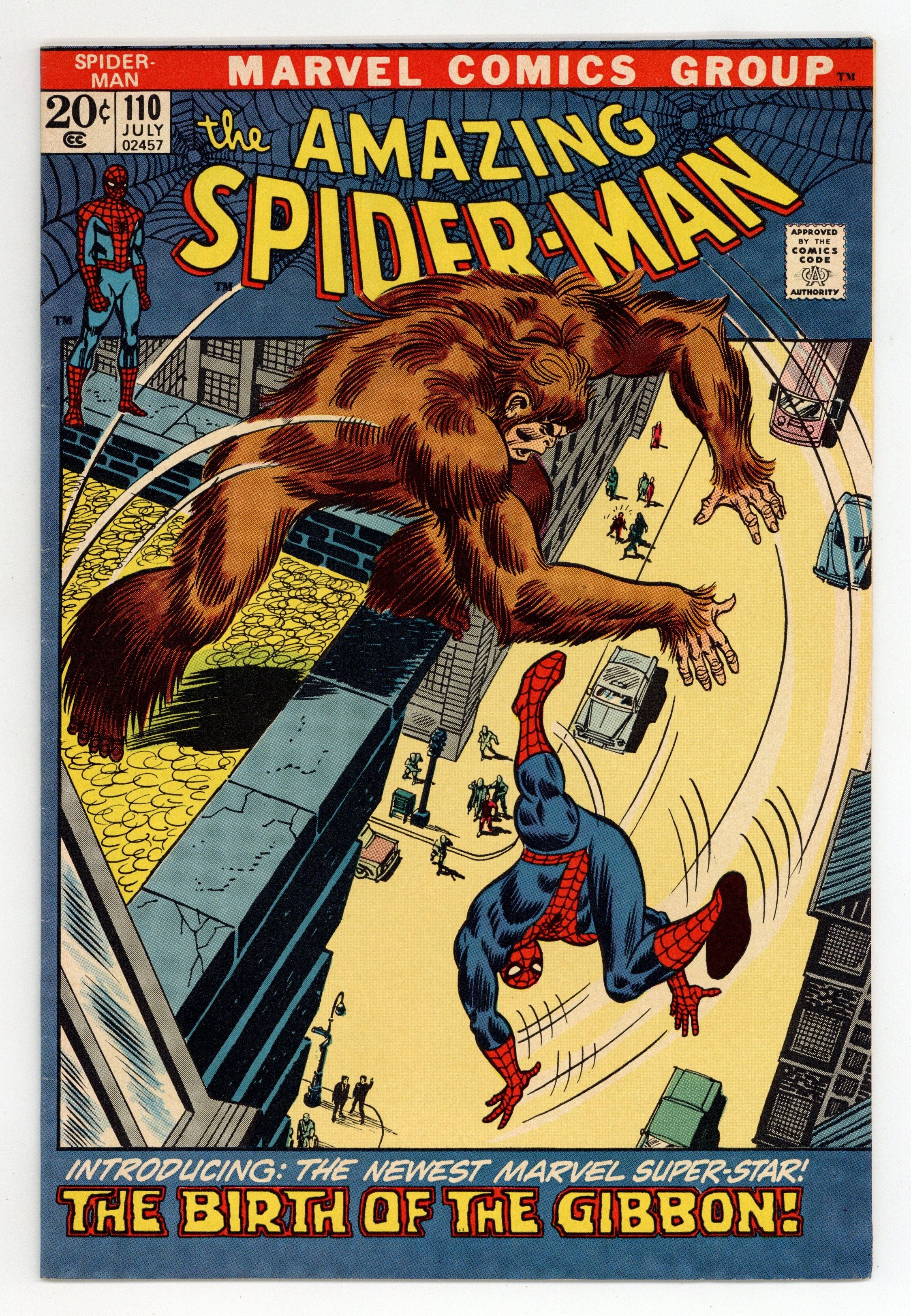 Starts Jan 26 First appearance of the Gibbon in "The Birth of the Gibbon!" Part 1 of 2. Script by Stan Lee. Pencils by John Romita. Inks by John Romita and Tony Mortellaro (backgrounds). Cover by John Romita and Frank Giacoia. On a Manhattan rooftop, the wall-crawler has a chance meeting with a man named Martin Blank. And after he talks with Spider-Man; the tall, lanky, and athletic Martin decides to become a superhero! But when Martin (in his ape costume) meets the web-slinger again, Spider-Man laughs at his offer to become partners, and Martin is hurt. And now the Gibbon is vulnerable to becoming partners...with someone else! Origin of the Gibbon. Cameo appearances by Aunt May, Gwen Stacy, Harry Osborn, Flash Thompson, and Kraven the Hunter. (Notes: This story completes Stan Lee's extraordinary scripting run on the Amazing Spider-Man title -- which began with issue #1in 1963. The letters page includes a letter from comics writer David Michelinie. This issue was reprinted in Marvel Tales #89.) 36 pages. Cover price $0.20.
