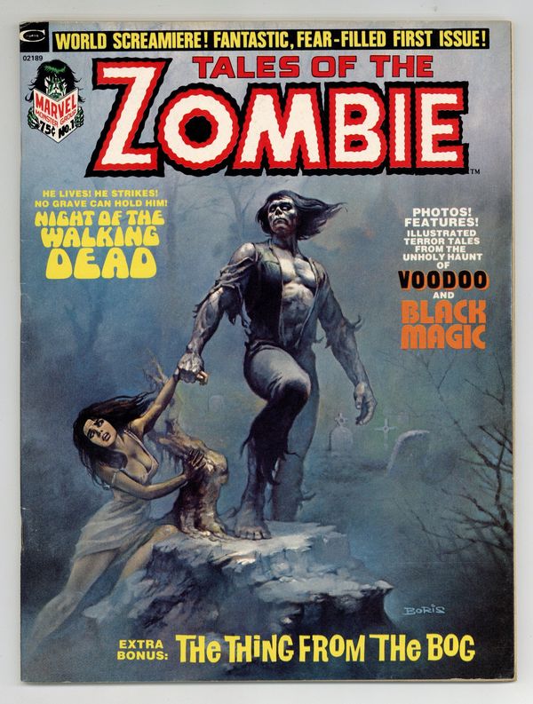 Starts Jan 26 Simon Garth dies but is brought back to life as a zombie and doomed to walk the earth as one of the living dead. In a three part story, "Alter of the Damned" (Script by Steve Gerber and Roy Thomas and art by John Buscema and Tom Palmer), "Zombie" (Script by Stan Lee and art by Bill Everett) and "Night of the Walking Dead" ) Script by Steve Gerber and art by John Buscema and Syd Shores) a former employee's revenge seals Garth's fate into becoming a zombie but he still fights to protect his daughter. Issue also has "Iron Head (Script by Stan Lee, art by Dick Ayers), an article about the zombie in the movies, "The Thing from the Bog" (script by Kit Pearson and Marv Wolfman and art by Pablos Marcos), and "Mastermind" (script and art by Tom Sutton). All stories are in black and white. Cover price $0.75.