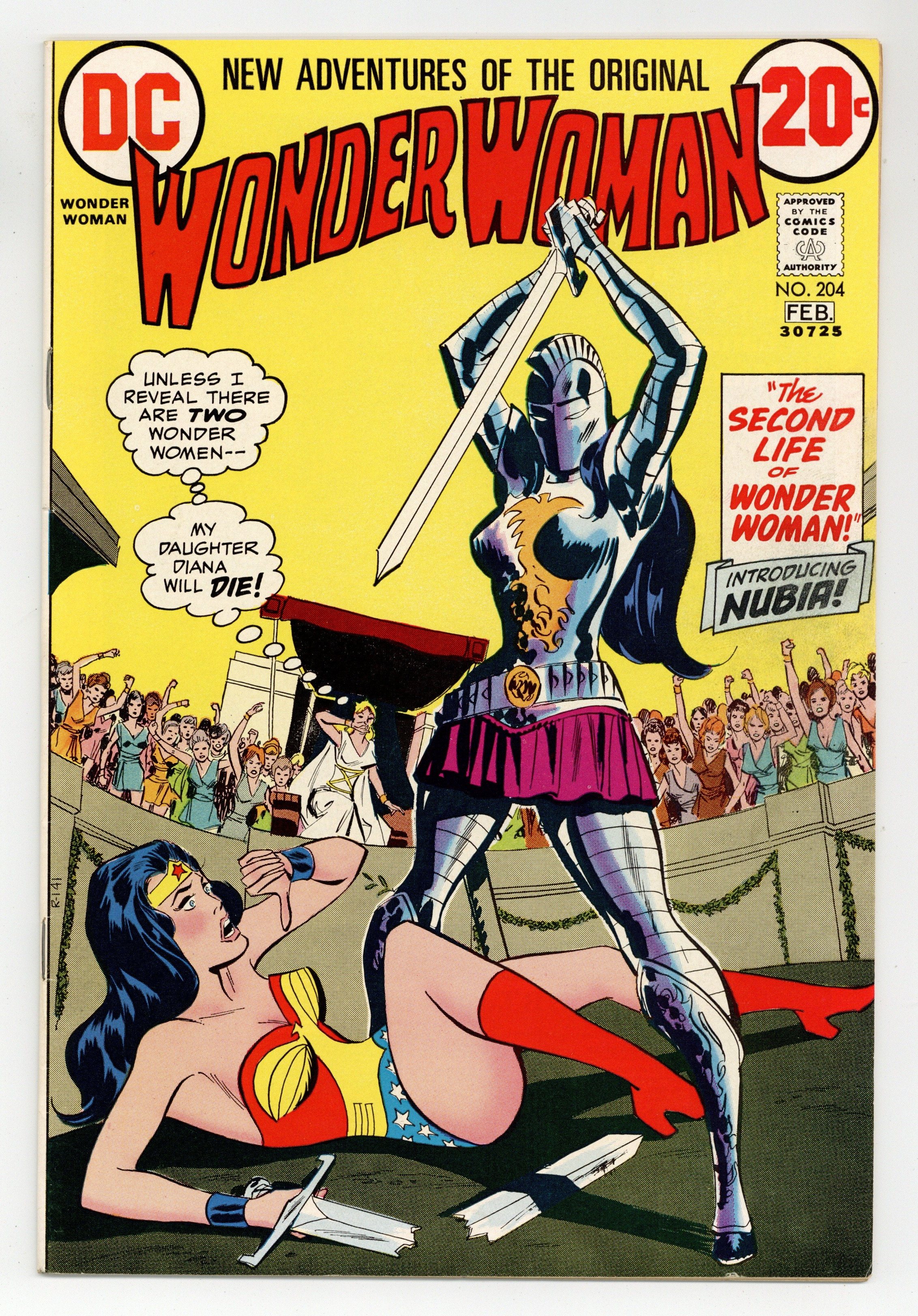 Starts Jan 26 20-cent cover price begins. Cover by Dick Giordano. "The Fist of Flame," script by Denny O'Neil, art by Dick Giordano; Diana and I-Ching visit Jonny Doubles office to find him gone, a smear of blood on the floor, and two Asian assassins inside; Diana fights cultists; Catwoman, wanting a gem, attacks Wonder Woman; Diana, Catwoman, and I-Ching phase out of their world, and re-materialize on the world of Nehwon, where they look up to see Fafhrd and the Grey Mouser, making their first appearance (cameo), before them. 36 pages, Full Color. Cover price $0.20.