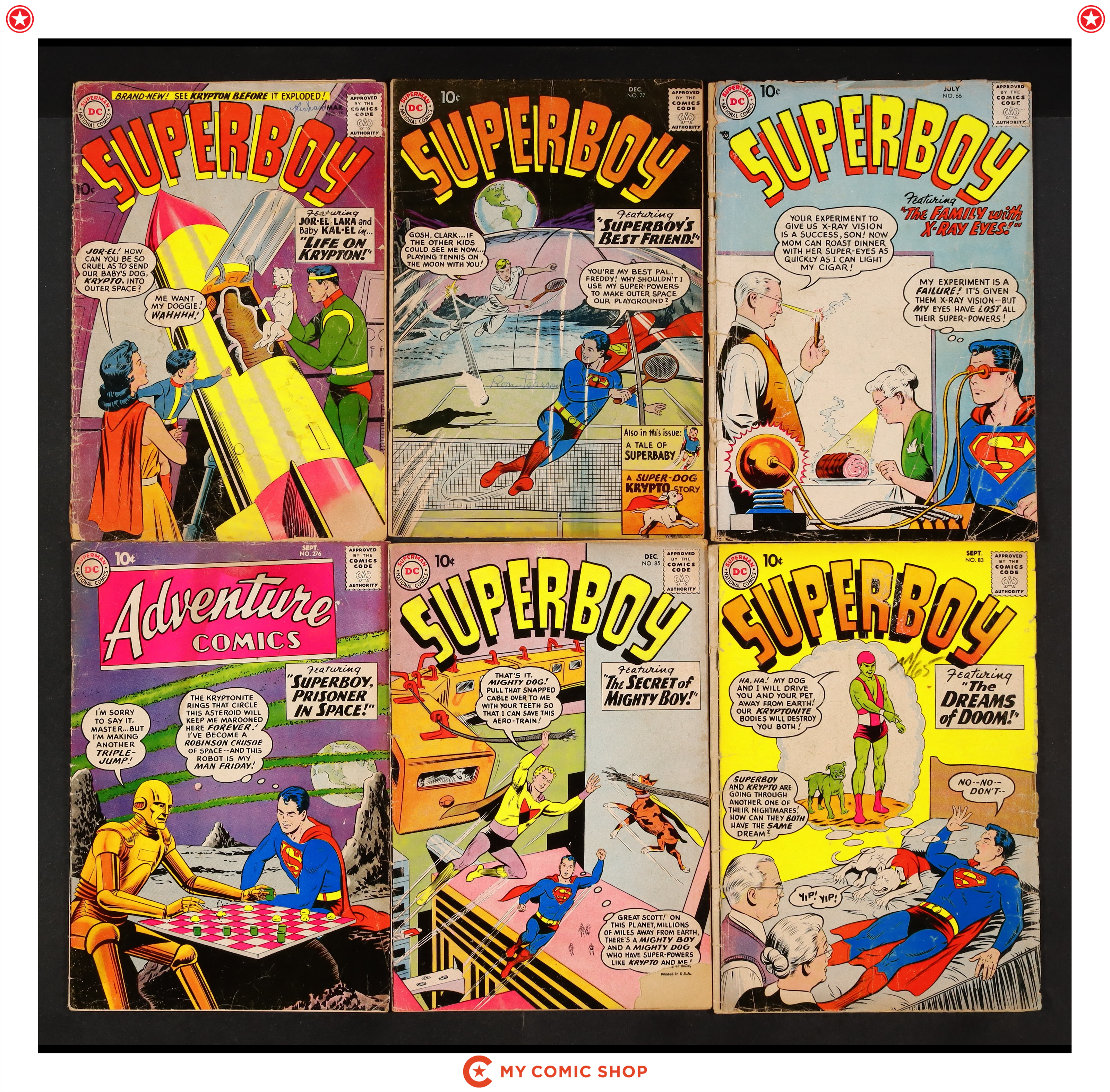 Issues 66, 77, 79, 83, and 85 of Superboy (1949-1979 1st Series DC); and 276 of Adventure Comics (1938 1st Series). Most will grade in the GD to FR range.