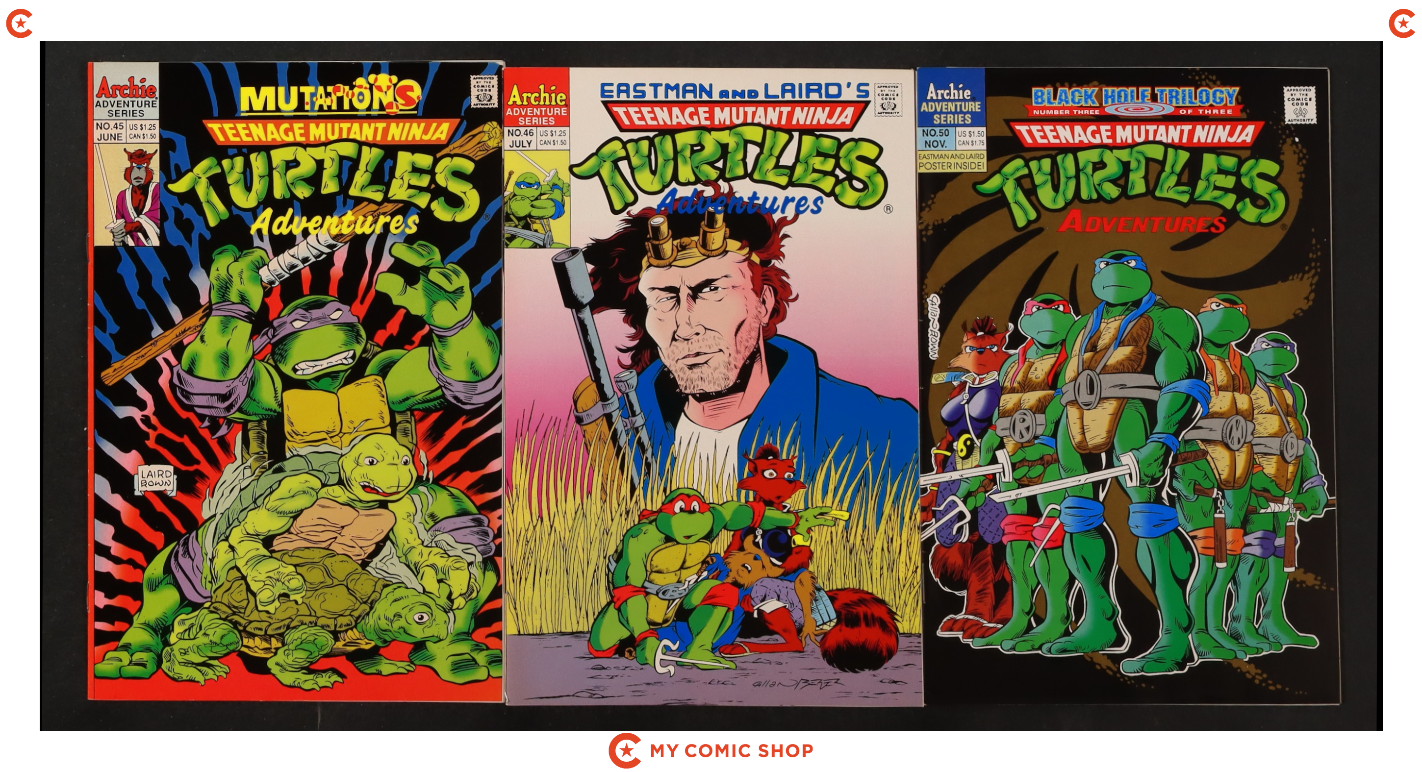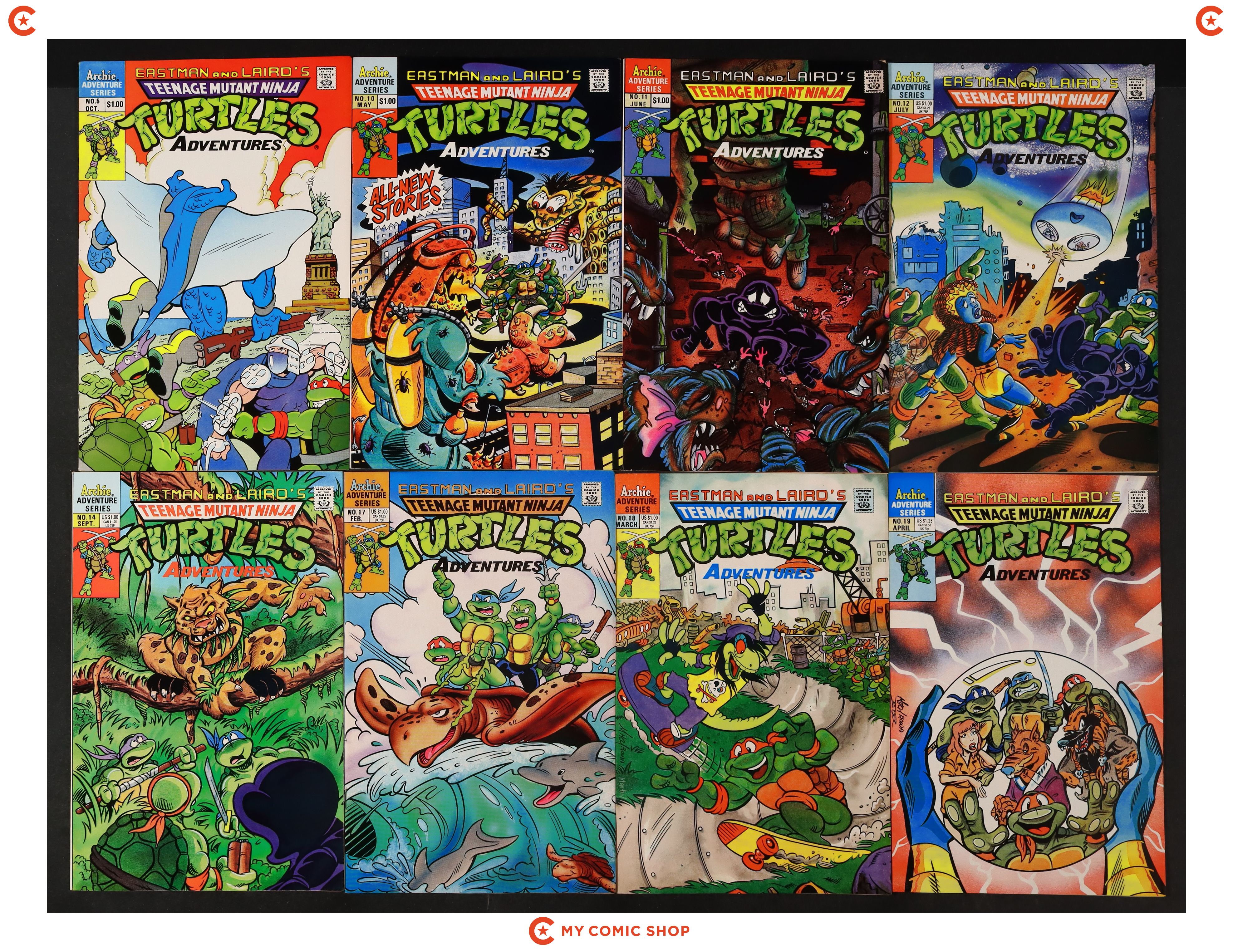 Issues 5, 10-12, 14, and 17-19 of Teenage Mutant Ninja Turtles Adventures (1989). Most will grade in the FN/VF to FN range.
