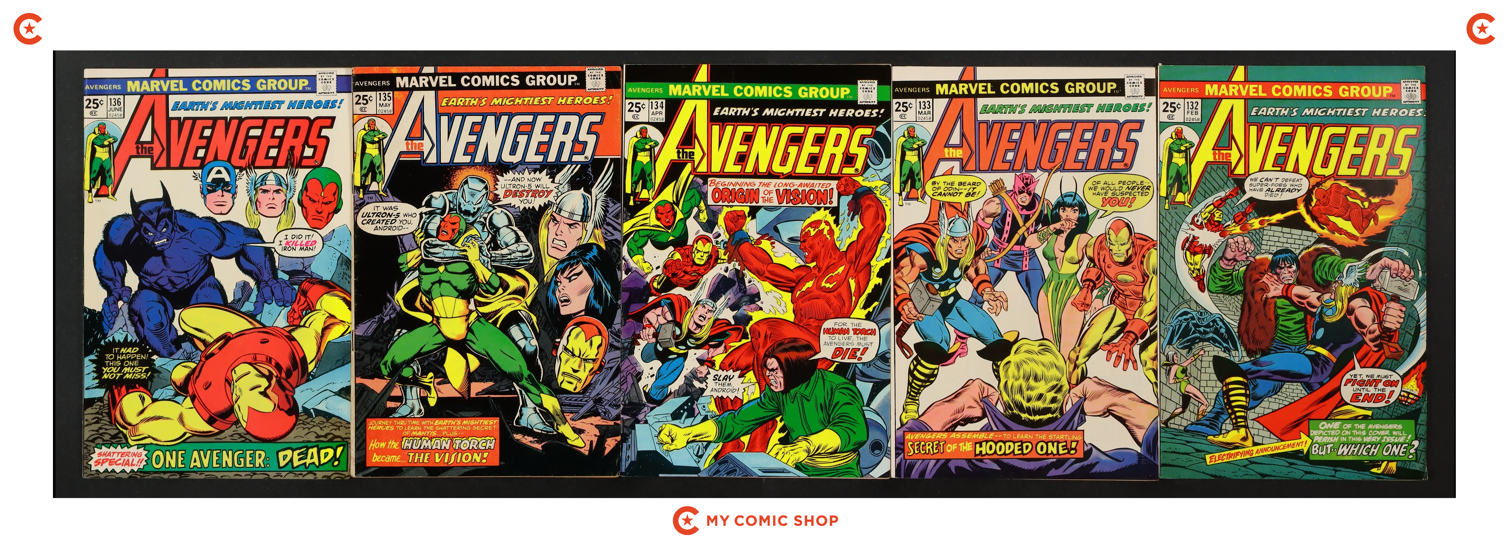 Issues 132-136 of Avengers (1963 1st Series). Most will grade in the FN to VF range with #135 grading GD.