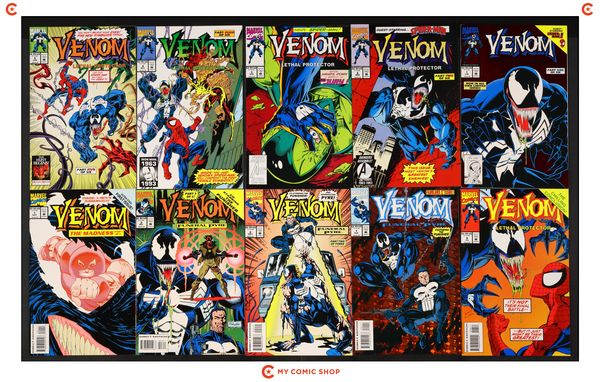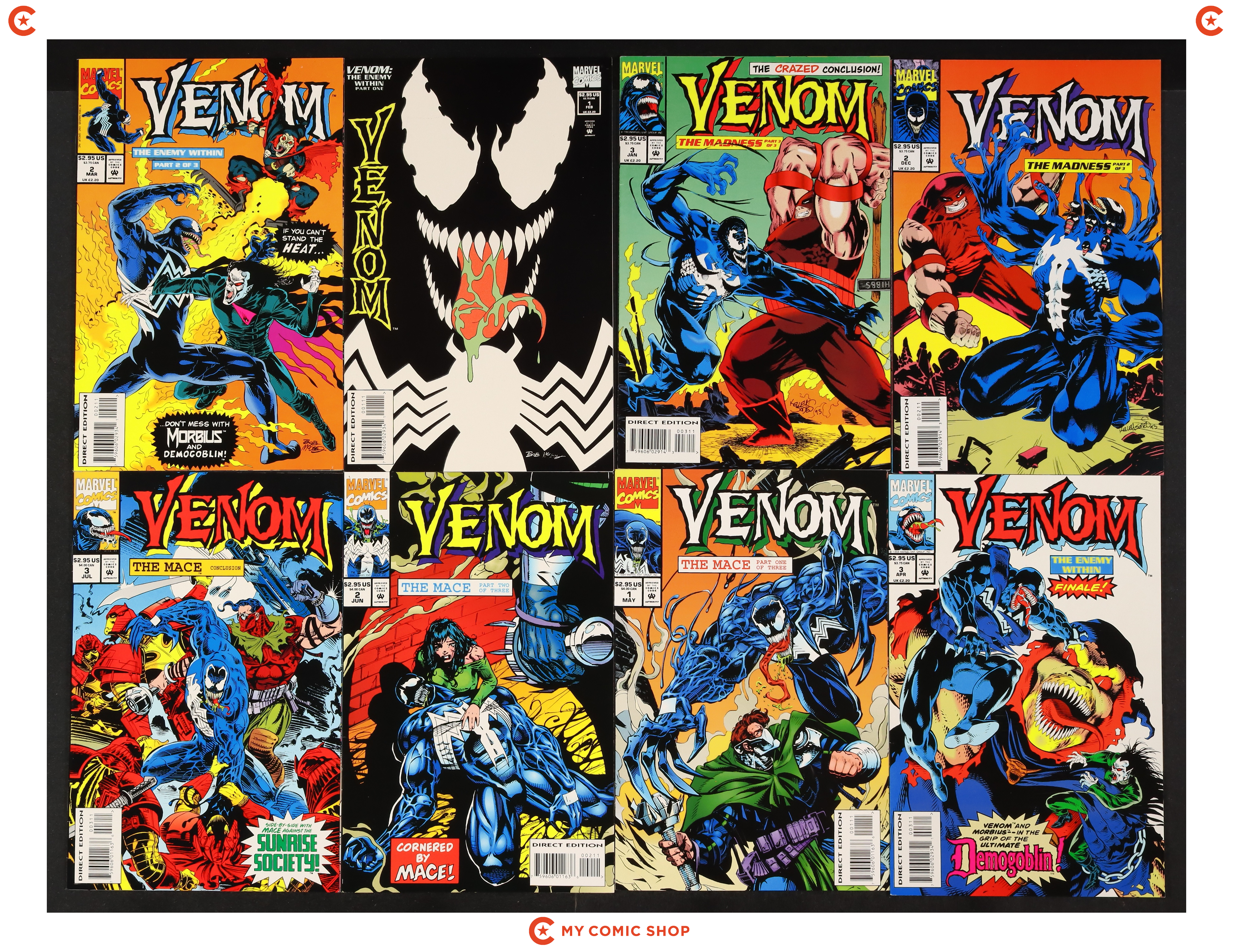 Issues 1A.D, 2D, 3D, 4D, 5D, 6 of Venom Lethal Protector (1993); 1, 2, 3 of Venom Funeral Pyre (1993); 1, 2, 3 of Venom The Madness (1993); 1, 2, 3 of Venom The Enemy Within (1994); and 1, 2, 3 of Venom The Mace (1994). Most will grade in the FN to VF+ range.