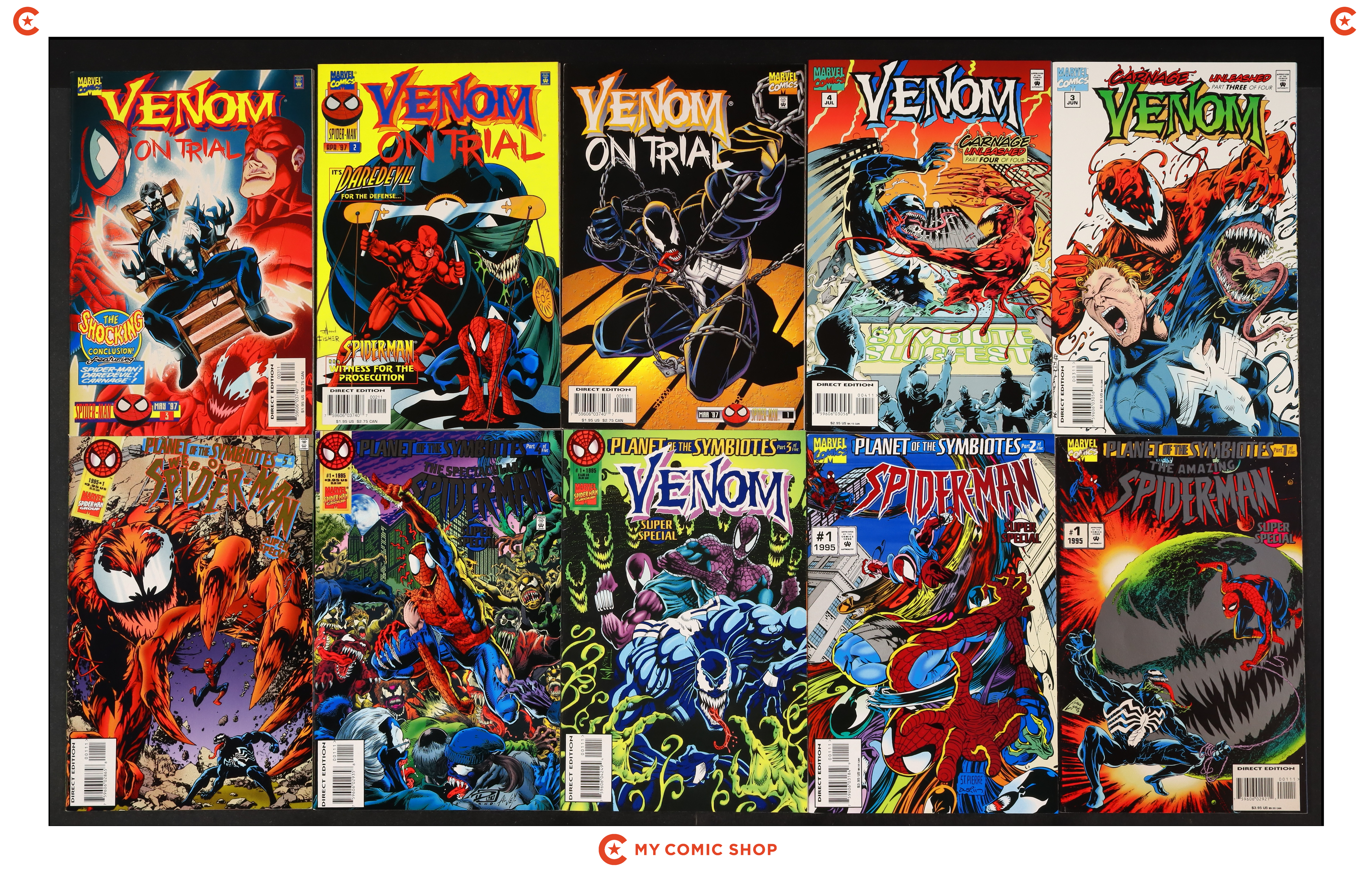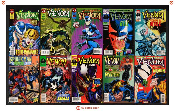 Issues 1D, 2, 3, 4 of Venom Nights of Vengeance (1994); 1D, 2, 3, 4 of Venom Separation Anxiety (1994); 1, 2, 3, 4 of Venom Carnage Unleashed (1995); 1, 2, 3 of Venom on Trial (1997); Amazing Spider-Man Super Special (1995) 1D; Spider-Man Super Special (1995) 1; Venom Super Special (1995) 1; Spectacular Spider-Man Super Special (1995) 1D; and Web of Spider-Man Super Special (1995) 1D. Most will grade in the FN to VF+ range.