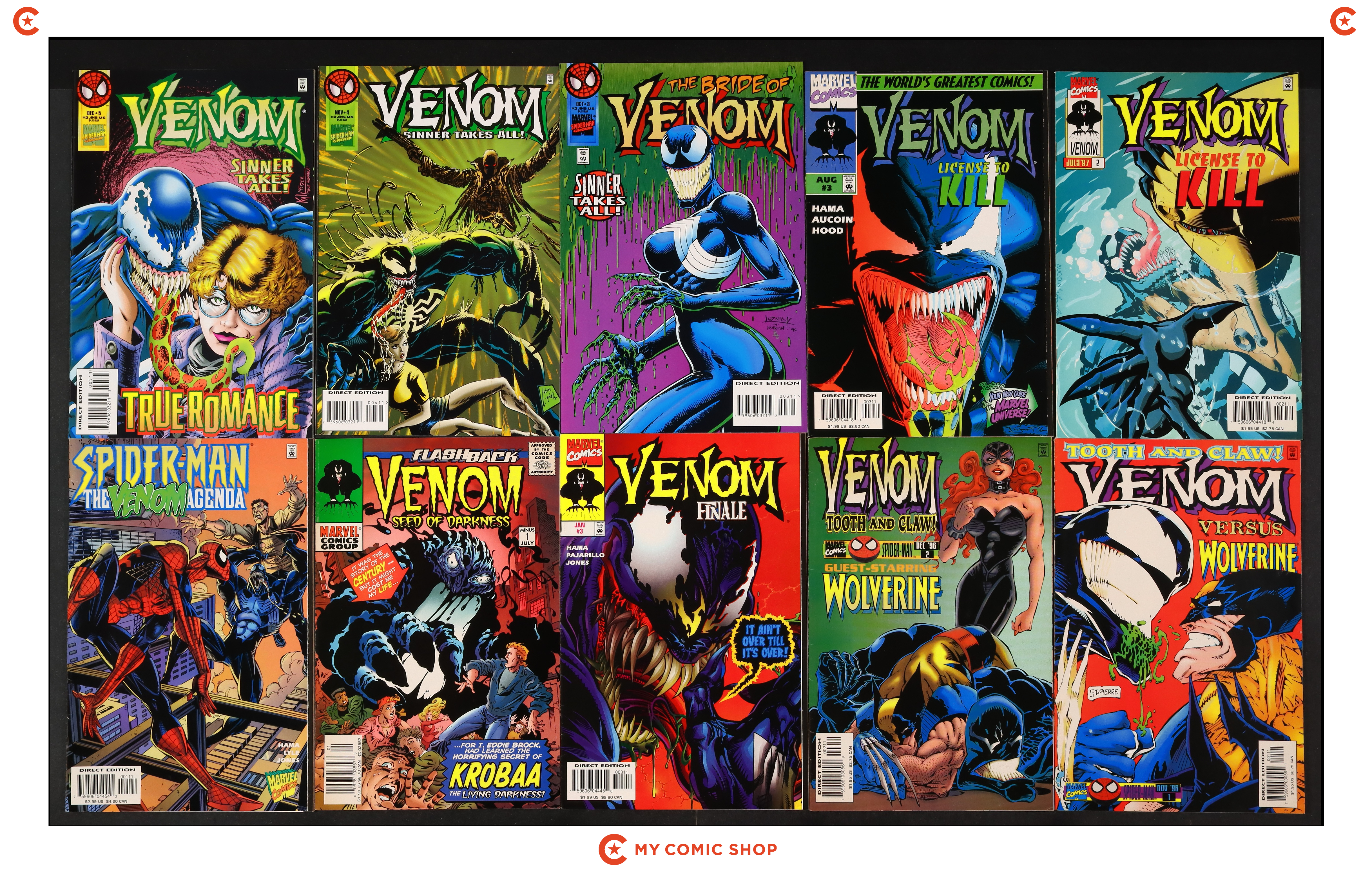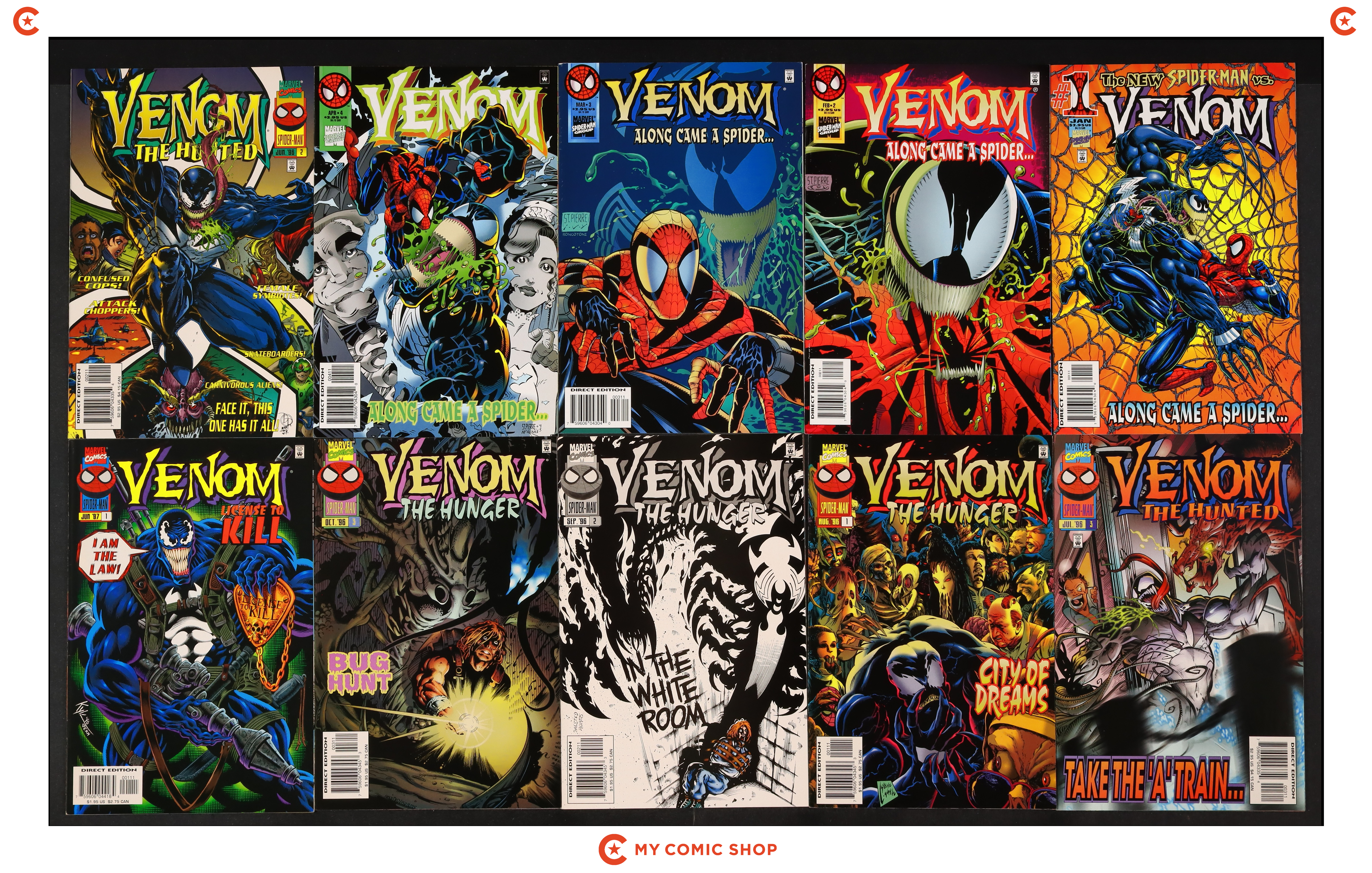 Issues 1, 2, 3, 4 of Venom Along Came a Spider (1996); 2, 3 of Venom The Hunted (1996); 1, 2, 3 of Venom The Hunger (1996); 1, 2, 3 of Venom License to Kill (1997); 3, 4, 5 of Venom Sinner Takes All (1995); 1, 2 of Venom Tooth and Claw (1996); Venom Finale (1997) 3; Venom Seed of Darkness Minus 1 (1997) -1; and Spider-Man The Venom Agenda (1998) 1. Most will grade in the VF- to VF+ range.