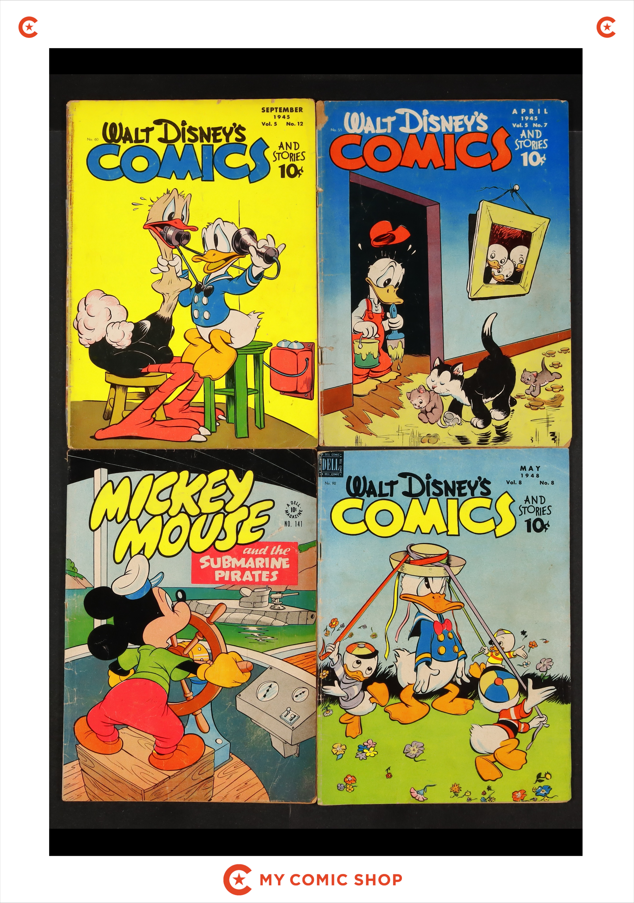 Issues 55, 60, and 92 of Walt Disney's Comics and Stories (1940 Dell/Gold Key/Gladstone); and 141 of Four Color (1942-1962 Dell 2nd Series). Most will grade in the GD range.