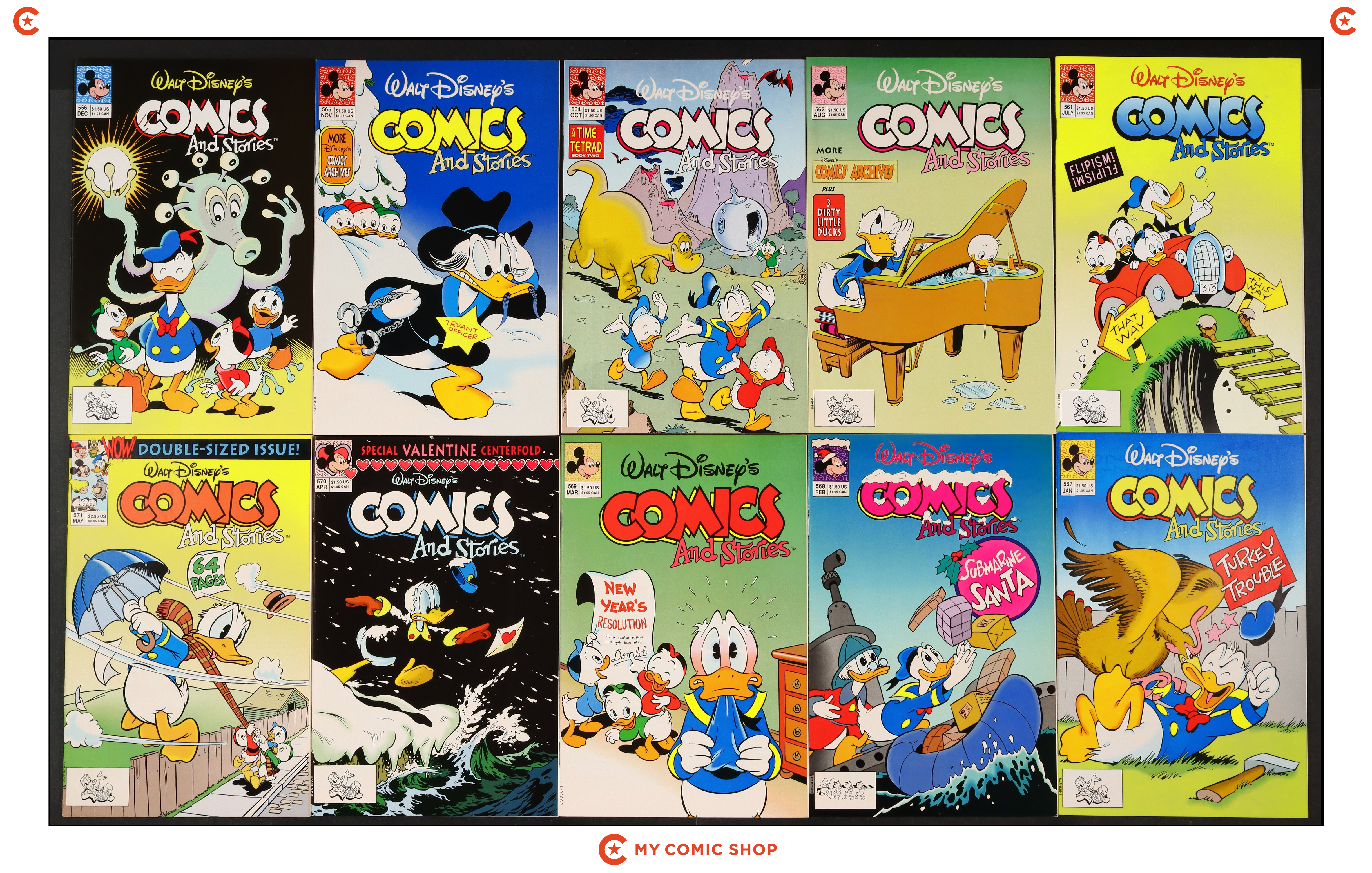 Issues 561, 562, 564, 565, 566, 567, 568, 569, 570, 571 of Walt Disney's Comics and Stories (1940 Dell/Gold Key/Gladstone). Most will grade in the FN/VF to VF/NM range.