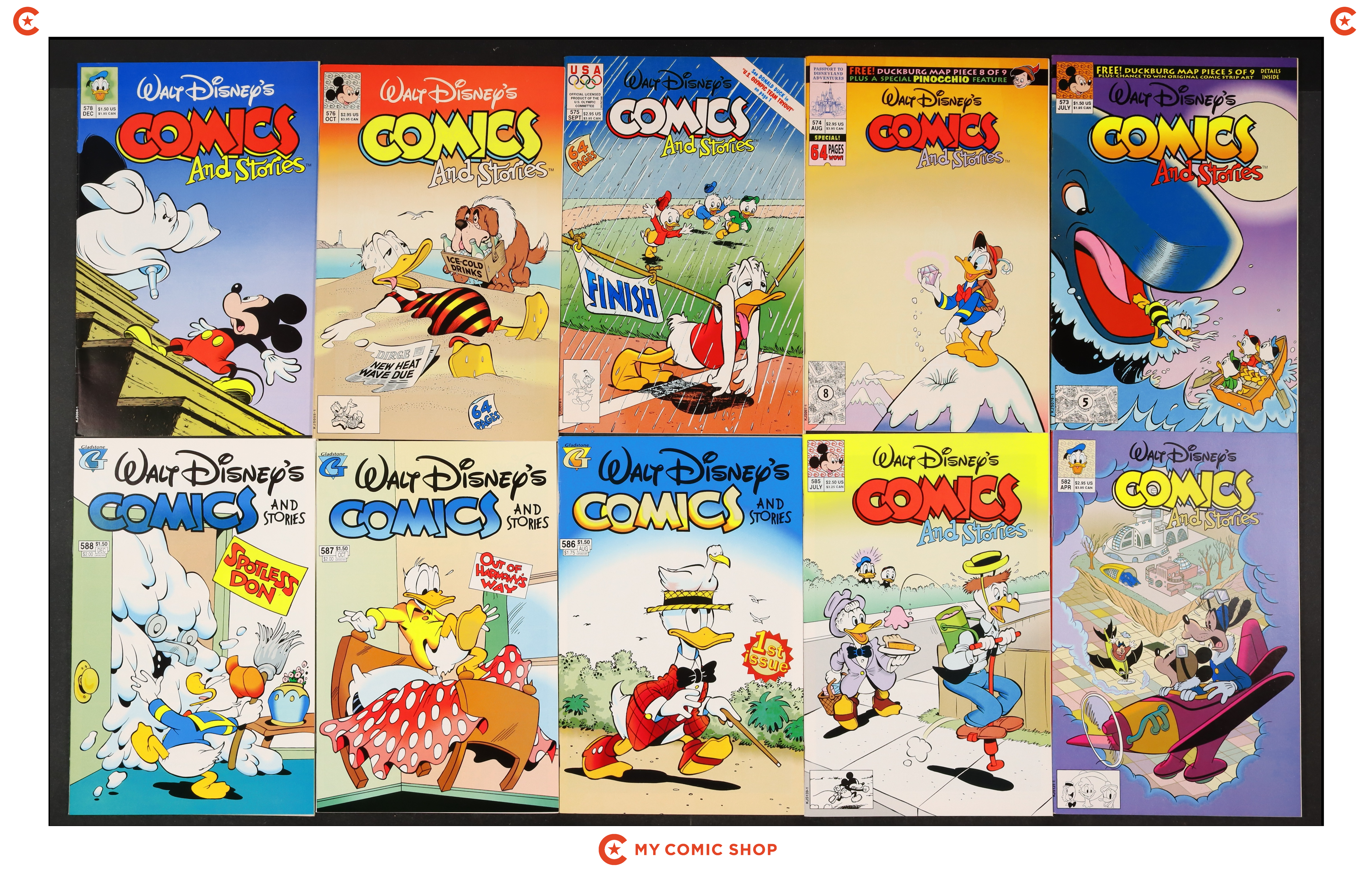 Issues 573, 574, 575, 576, 578, 582, 585, 586, 587A, 588 of Walt Disney's Comics and Stories (1940 Dell/Gold Key/Gladstone). Most will grade in the VG/FN to FN/VF range.