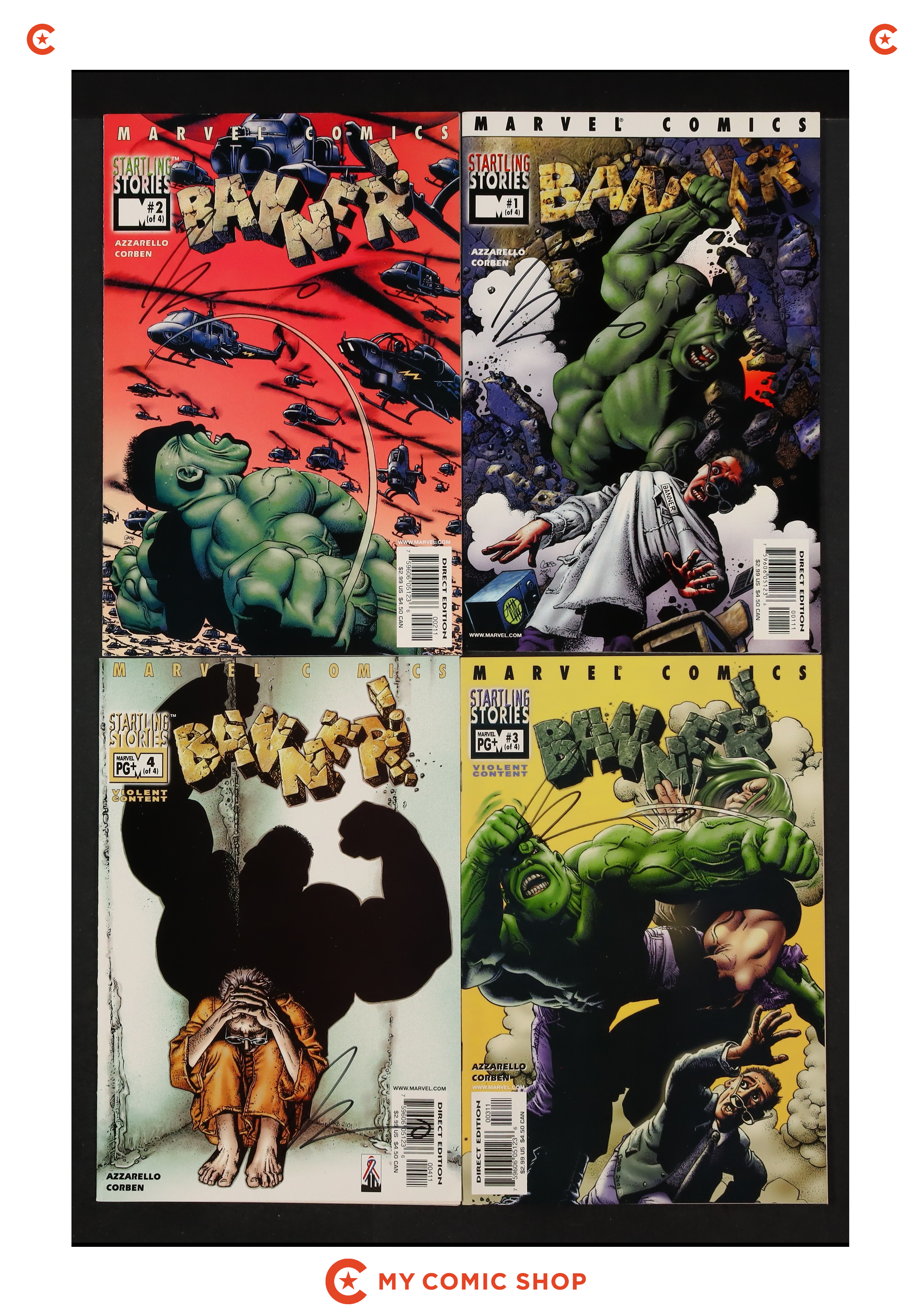 Issues 1, 2, 3D, 4 of Startling Stories Banner (2001) signed by Brian Azzarello. No autograph certification is included. Most will grade in the