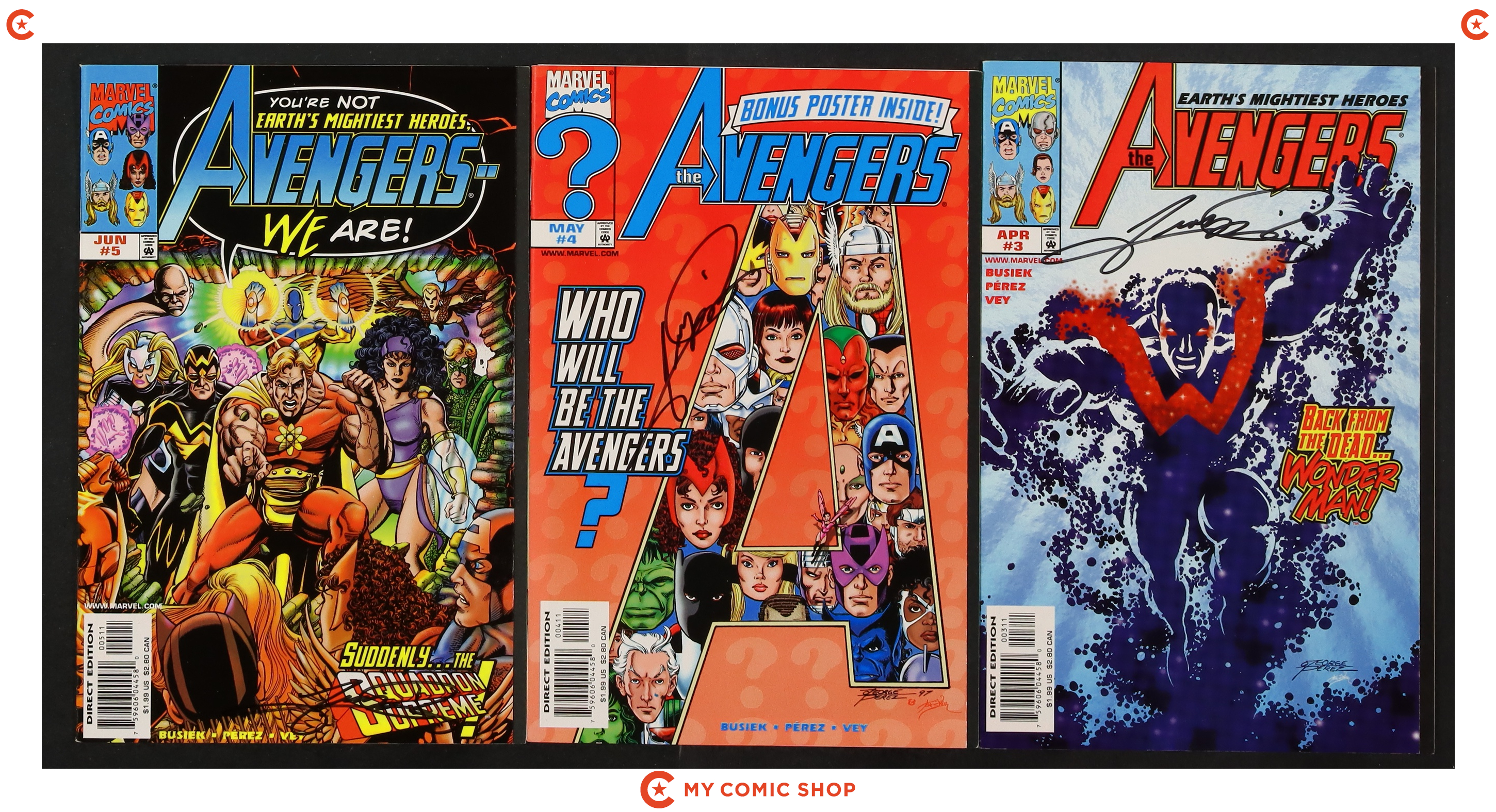 Issues 3, 4, 5 of Avengers (1998 3rd Series) signed by Kurt Busiek. No autograph certification is included. Most will grade in the VG to FN range.