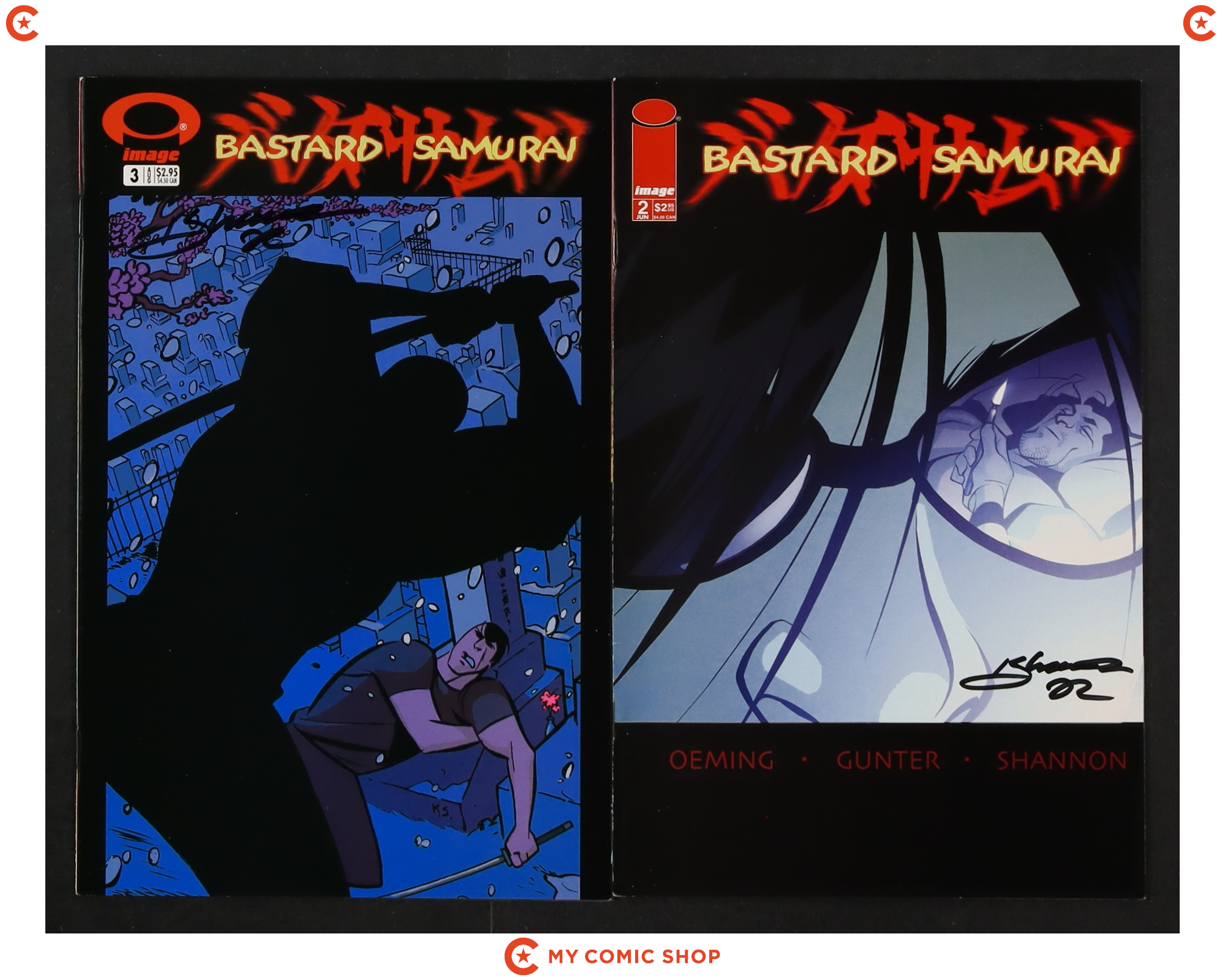 Issues 2, 3 of Bastard Samurai (2002) signed by Kelsey Shannon. No autograph certification is included. Most will grade in the FN to VF range.