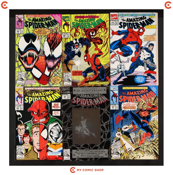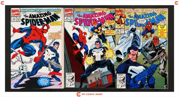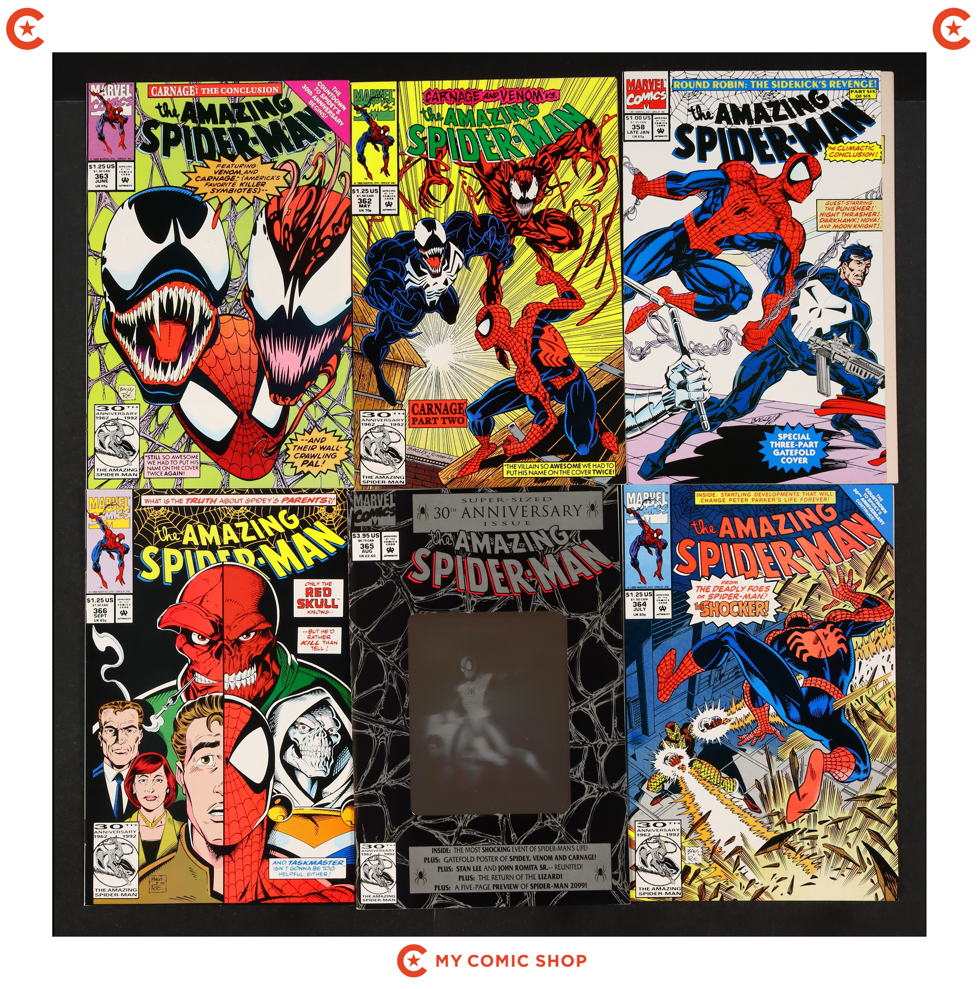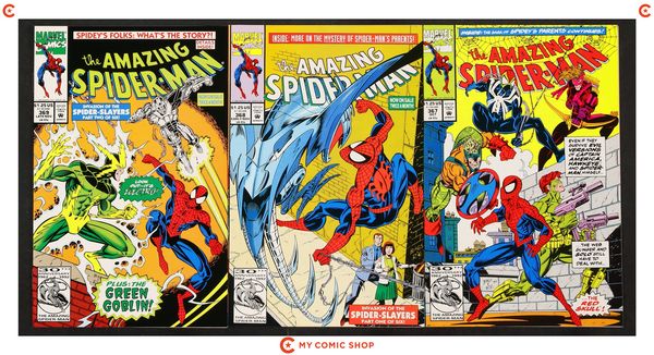 Issues 357, 358, 364, 370, 373D, 374D, 375N, 376-378 of Amazing Spider-Man (1963 1st Series); Spider-Man (1990 Marvel) 26D; Spectacular Spider-Man (1976 1st Series) 189B.D; Web of Spider-Man (1985 1st Series) 100D; and True Believers Absolute Carnage Maximum Carnage (2019) 1. Most will grade in the FN- to VF range.