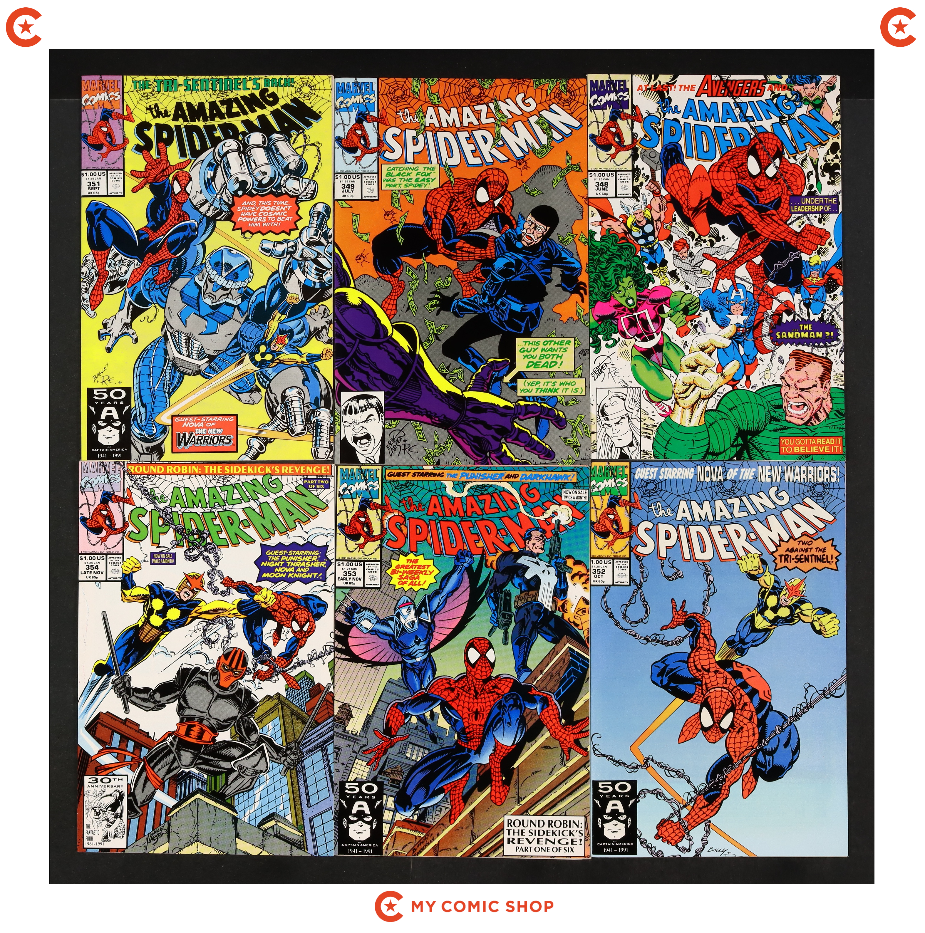 Issues 348, 349, 351, 352, 353, 354, 355, 357, 358 of Amazing Spider-Man (1963 1st Series). Most will grade in the FN/VF to VF/NM range, with #349 grading at VG/FN.