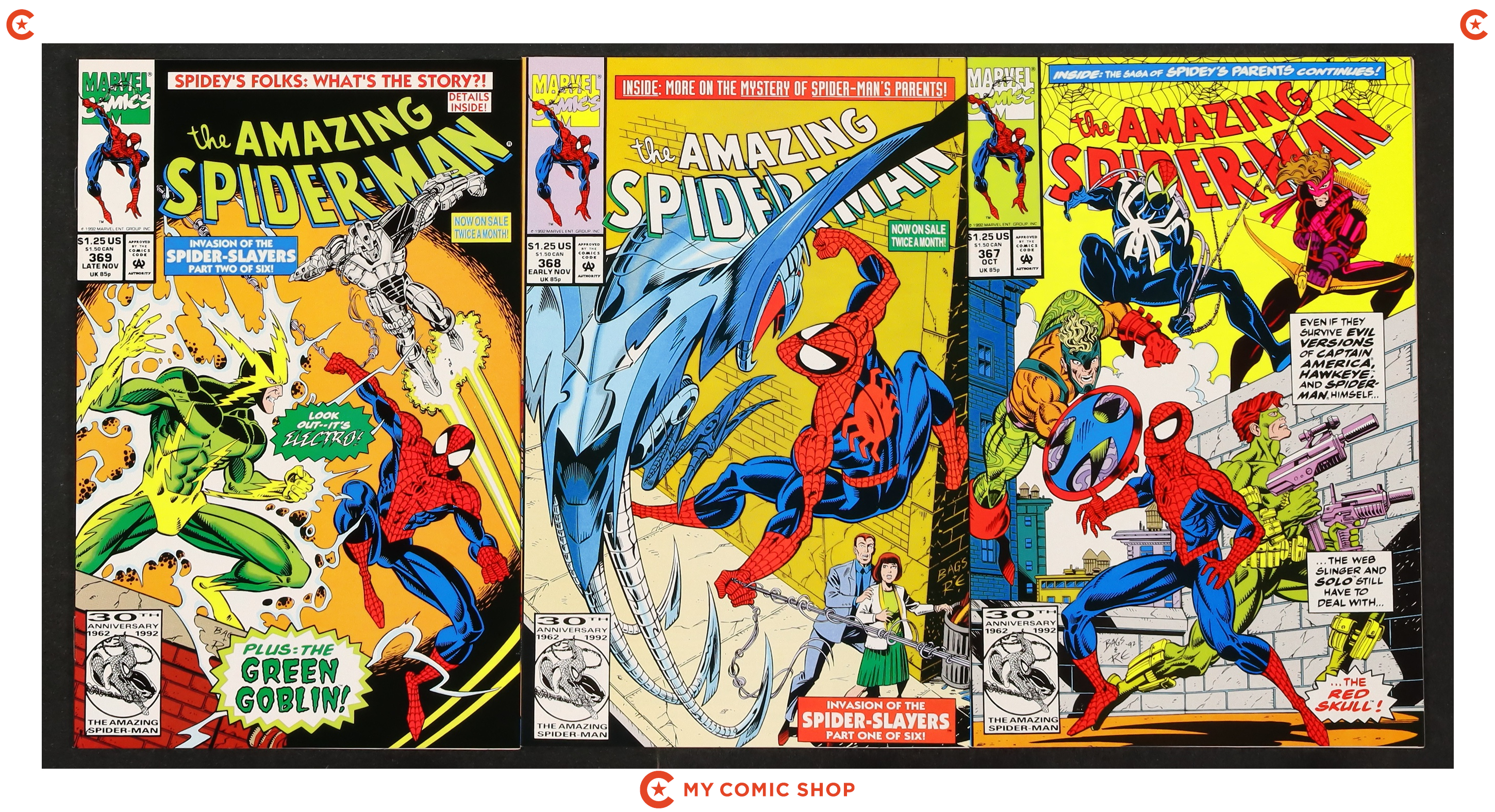 Issues 358, 362A, 363, 364, 365, 366, 367, 368, 369 of Amazing Spider-Man (1963 1st Series). Most will grade in the VF- to NM- range.