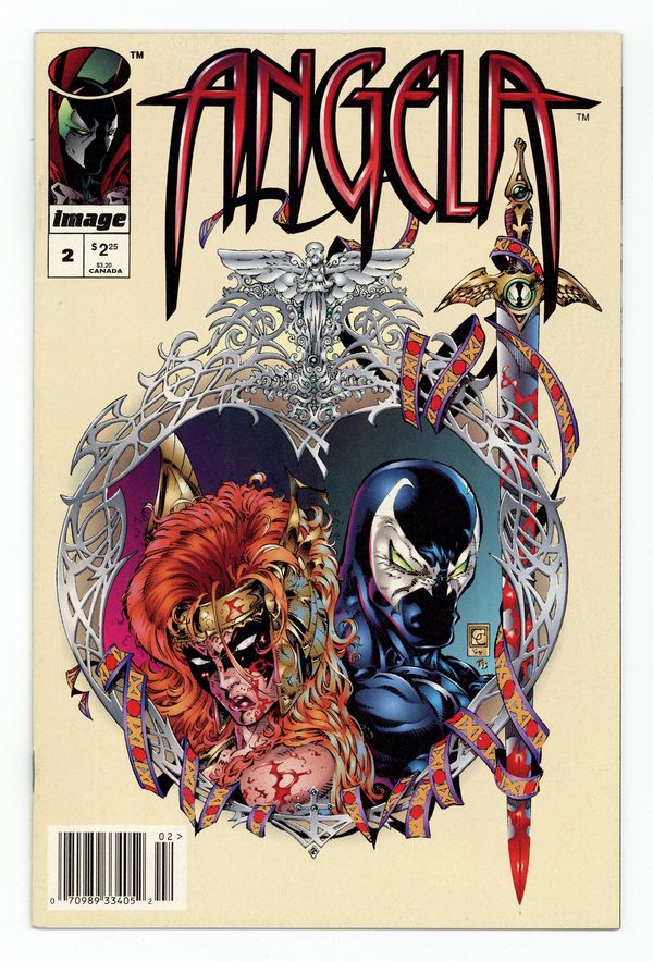 Starts May 25 Newsstand Edition. Cover art by Greg Capullo. Untitled Angela story, script by Neil Gaiman, pencils by Greg Capullo, inks by Mark Pennington; Beginning of love affair between Spawn and Angela. Angela pinup. 36 pgs. $2.25. Cover price $2.25.