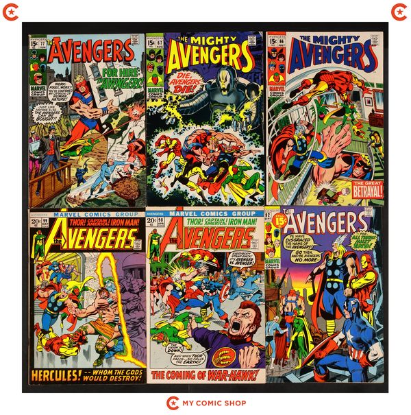 Issues 66, 67, 77, 92, 98, 99 of Avengers (1963 1st Series). Most will grade in the GD/VG to VG/FN range, with #77 grading at FR/GD.