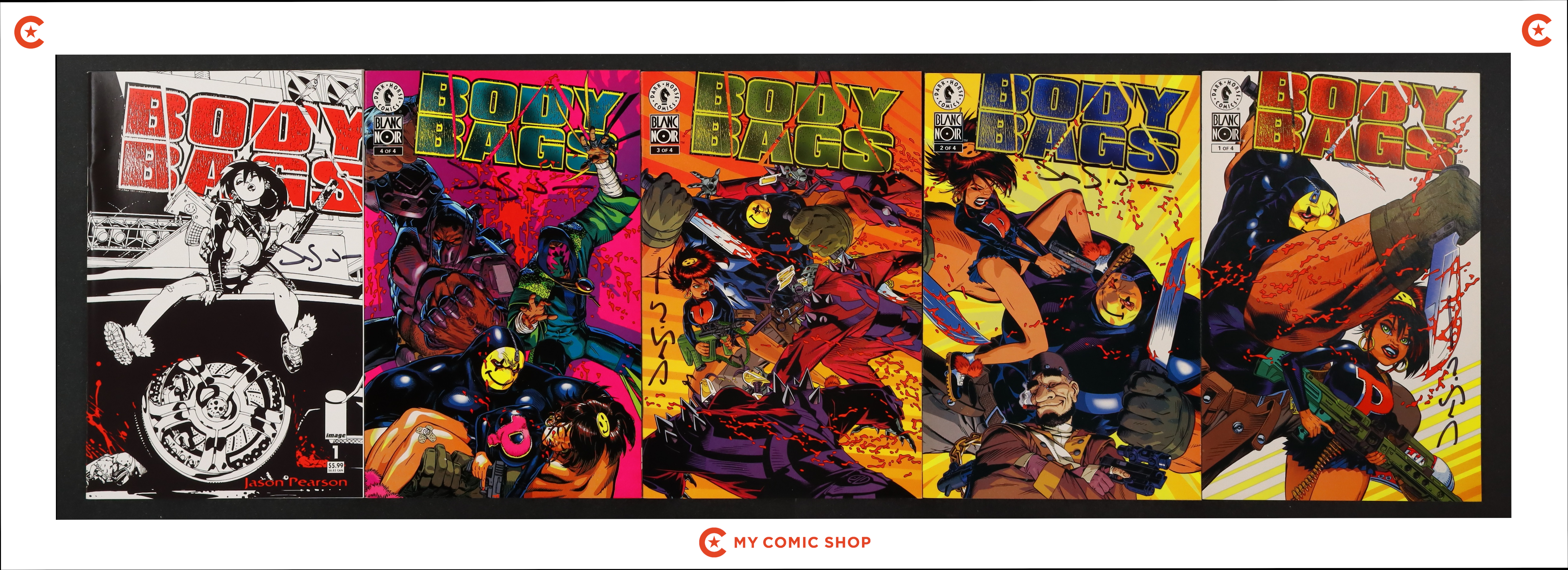 Issues 1-4 of Body Bags (1996 1st Series) and issue 1B of Body Bags 3 The Hard Way (2006) signed by Jason Pearson. No autograph certification is included. Most will grade in the VG to FN range.