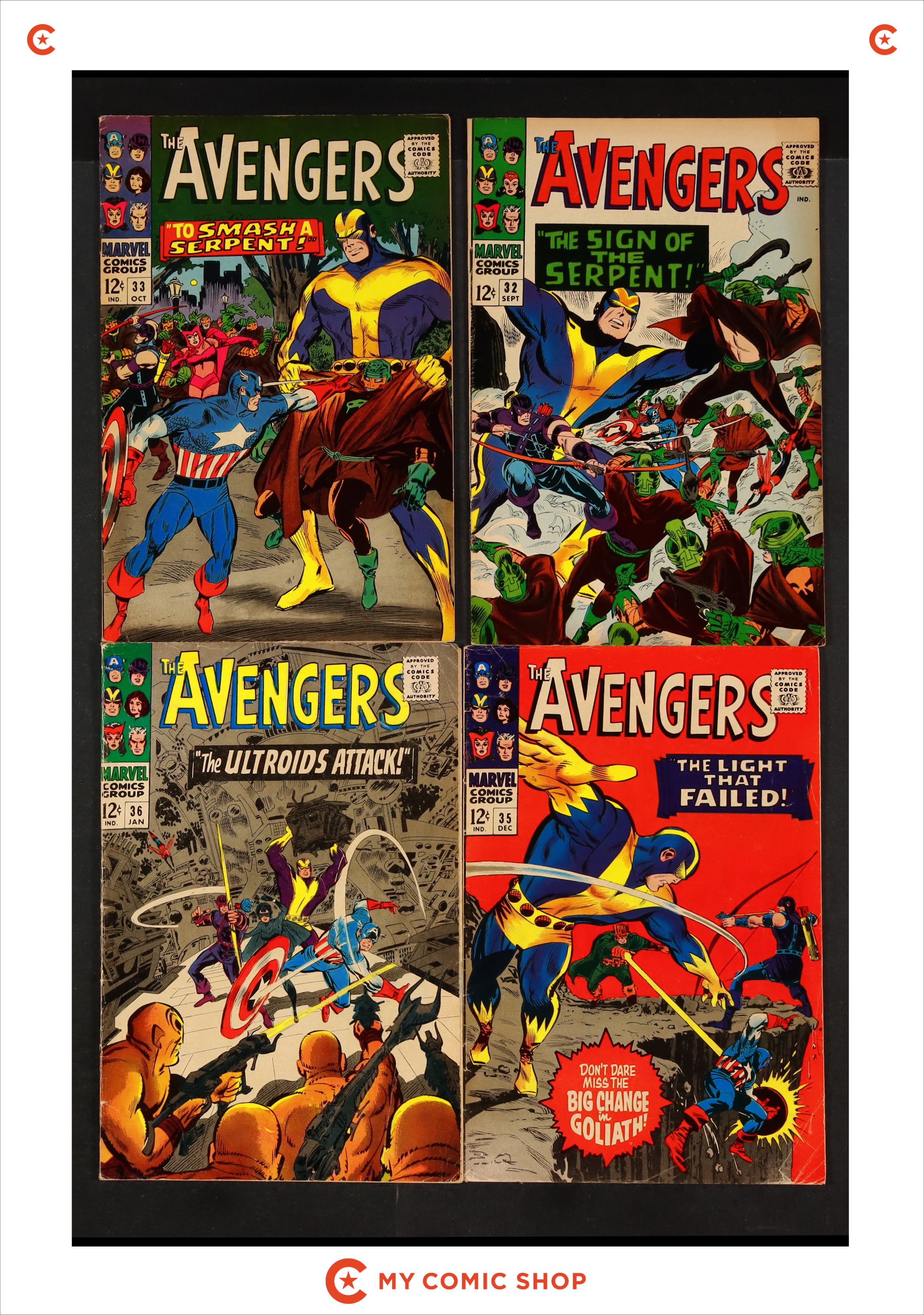 Issues 32, 33, 35, 36 of Avengers (1963 1st Series). Most will grade in the GD/VG to VG/FN range.